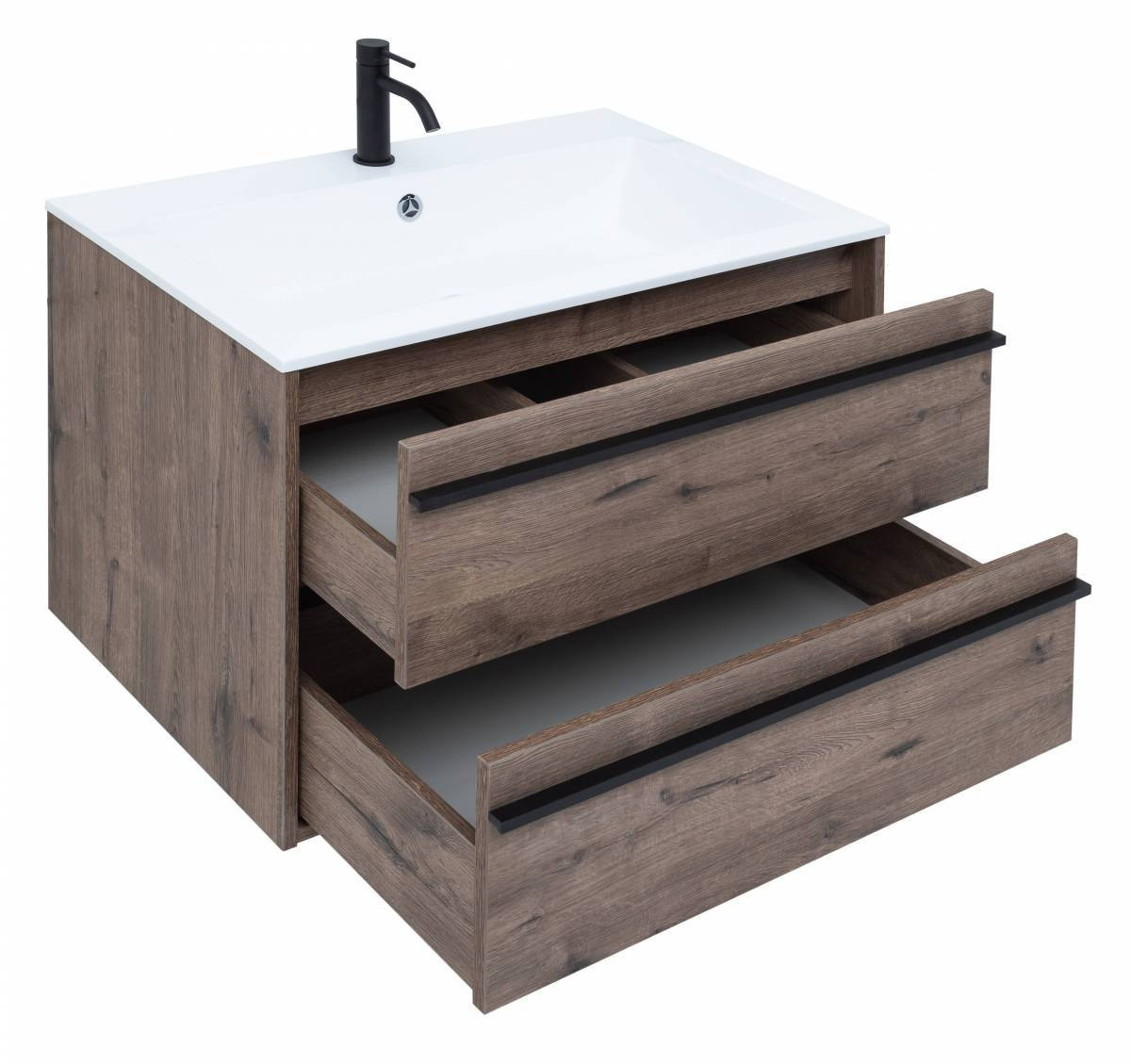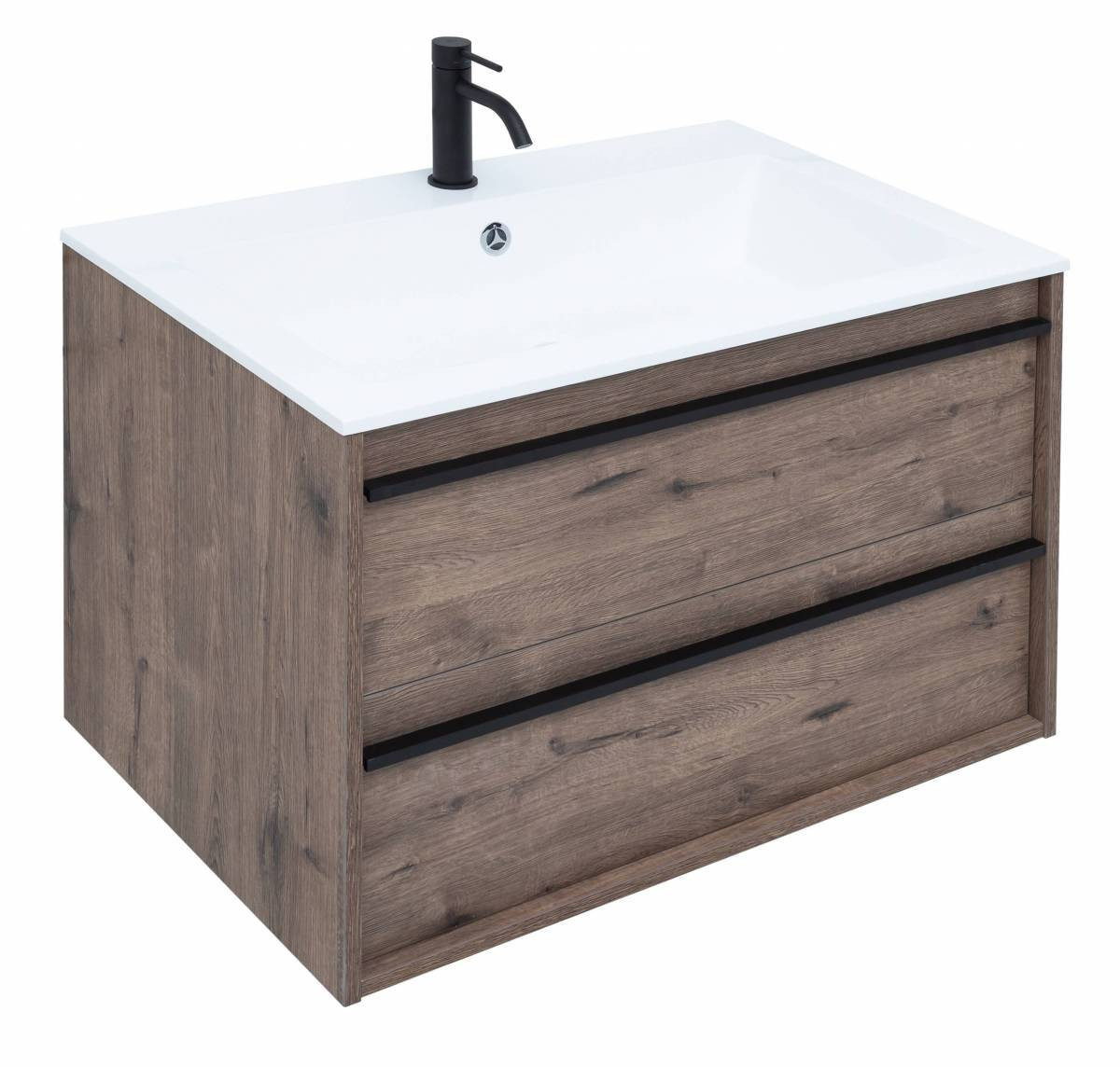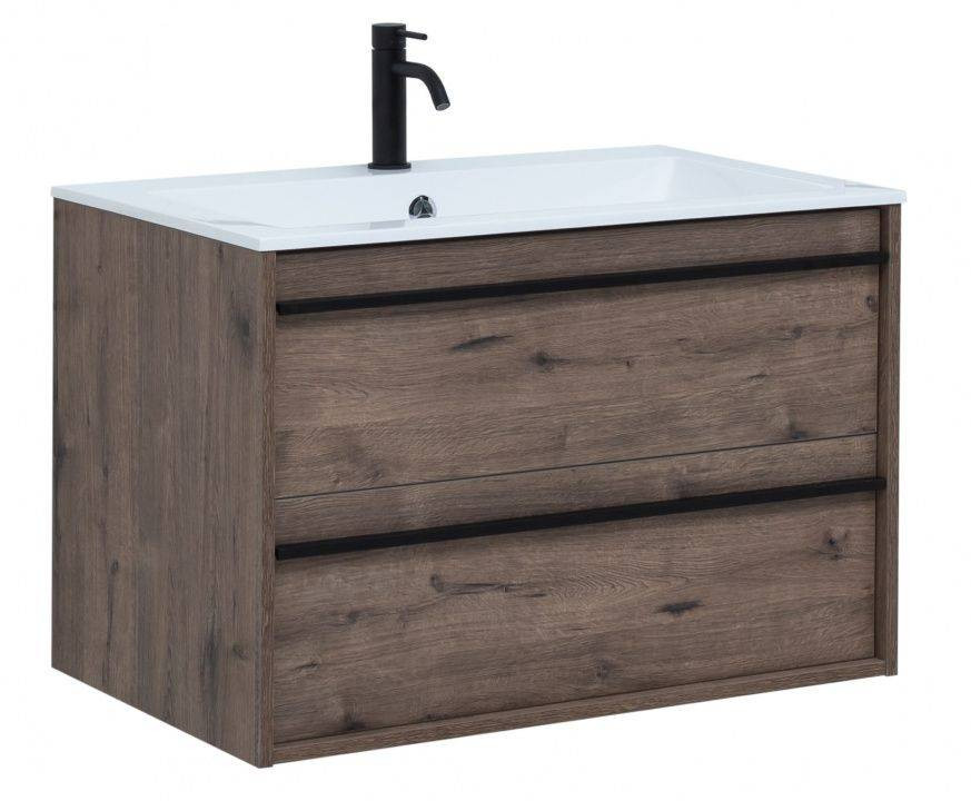 Тумба с раковиной Aquanet Lino 80 в цвете "дуб веллингтон" - яркий пример мебели в эко-стиле. Яркая, приятная глазу цветовая гамма плюс текстурная поверхность, максимально приближенная по тактильным ощущениям к натуральной древесной поверхности, является визитной карточкой коллекции. У нее удобная зона хранения: два выдвижных ящика, оборудованных доводчиками, словно утоплены внутрь корпуса. Тонкие изящные ручки во всю ширину ящиков. Именно они находятся в одной плоскости с боковыми стенками. Выглядит стильно. К тому же, безопасно, так как нет выступающих деталей. Кстати, ручки отечественного производства. Сделаны из алюминия, чтобы исключить возможность коррозии, по заказу Aquanet специально для этой коллекции. Сверху на них нанесено эмалевое покрытие. Корпус и фасады тумбы шириной 80 см – из влагостойкого ЛДСП. Сверху установлена раковина «Электра» из литьевого мрамора. У нее максимально глубокая и объемная чаша, но все внутренние детали скруглены, так что приведение ее в порядок не составит труда, так как грязь не будет скапливаться в уголках.