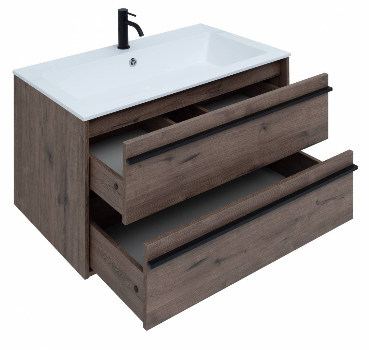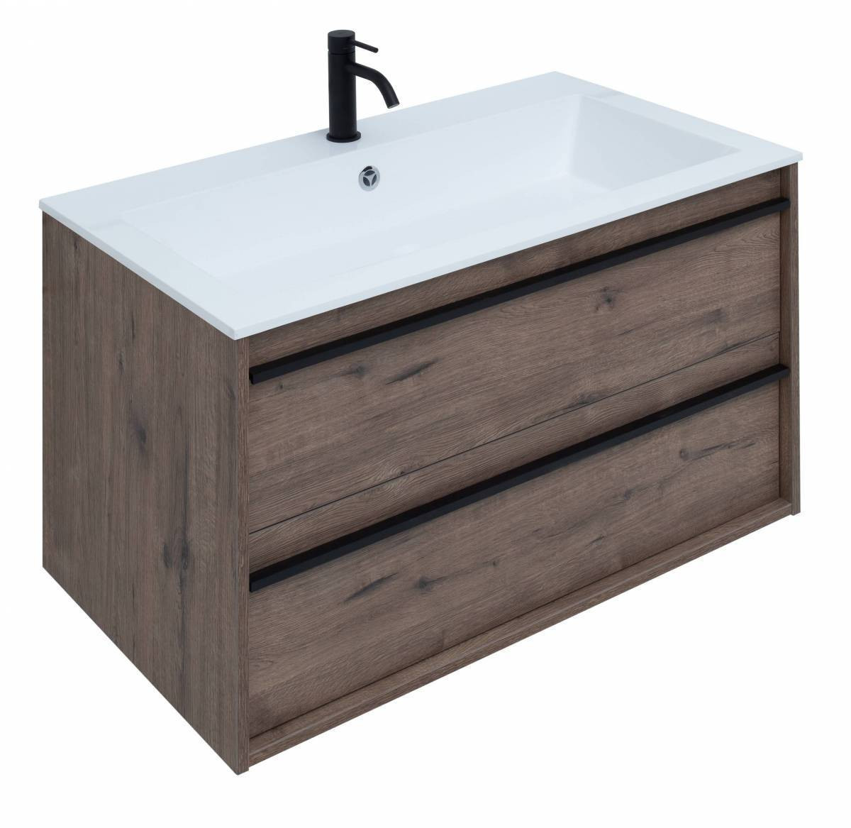 Тумба с раковиной Aquanet Lino 90 в цвете "дуб веллингтон" - яркий пример мебели в эко-стиле. Яркая, приятная глазу цветовая гамма плюс текстурная поверхность, максимально приближенная по тактильным ощущениям к натуральной древесной поверхности, является визитной карточкой коллекции. У нее удобная зона хранения: два выдвижных ящика, оборудованных доводчиками, словно утоплены внутрь корпуса. Тонкие изящные ручки во всю ширину ящиков. Именно они находятся в одной плоскости с боковыми стенками. Выглядит стильно. К тому же, безопасно, так как нет выступающих деталей. Кстати, ручки отечественного производства. Сделаны из алюминия, чтобы исключить возможность коррозии, по заказу Aquanet специально для этой коллекции. Сверху на них нанесено эмалевое покрытие. Корпус и фасады тумбы шириной 90 см – из влагостойкого ЛДСП. Сверху установлена раковина «Электра» из литьевого мрамора. У нее максимально глубокая и объемная чаша, но все внутренние детали скруглены, так что приведение ее в порядок не составит труда, так как грязь не будет скапливаться в уголках.