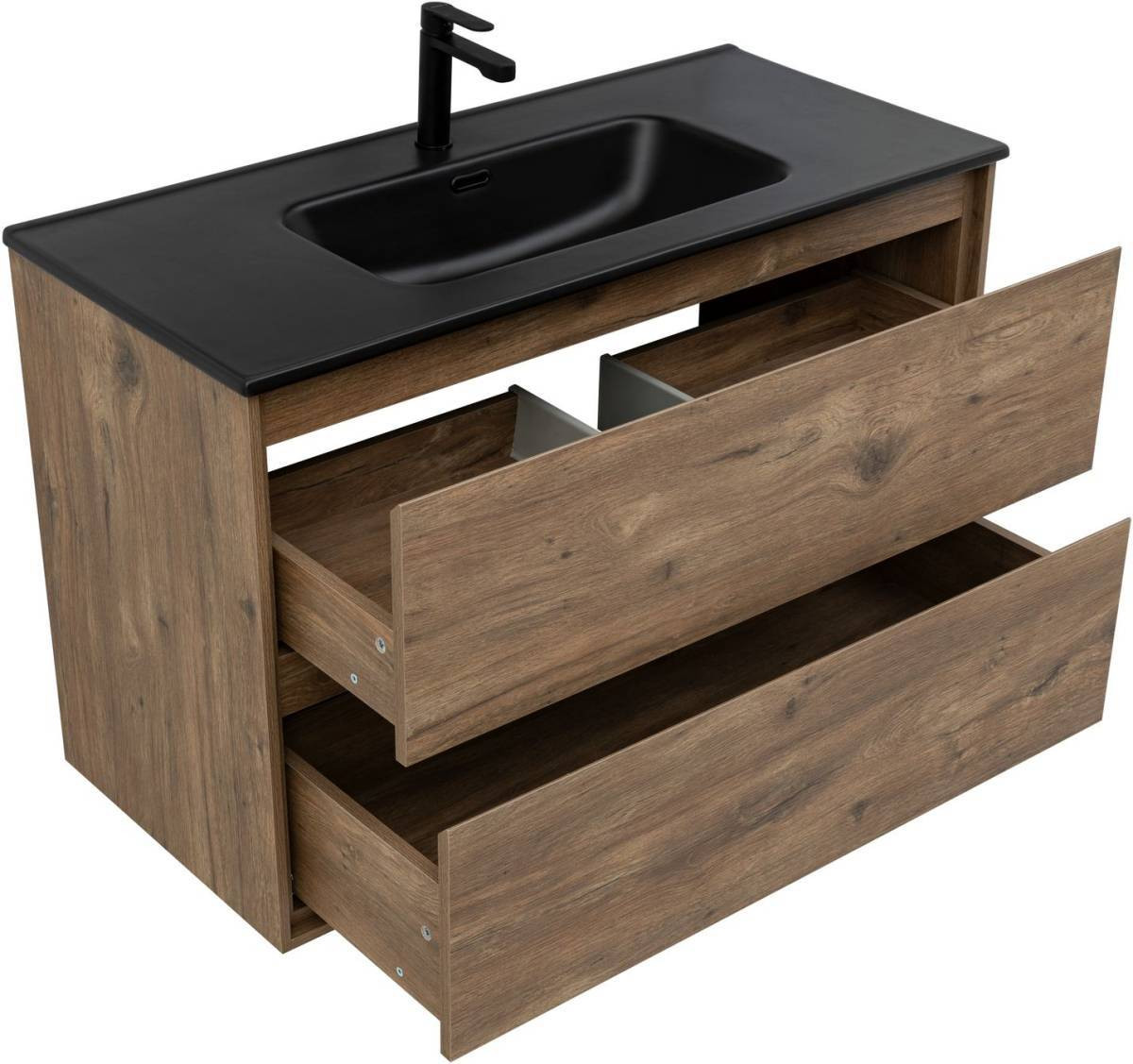 Кроме того, надёжные навесы, способные выдерживать нагрузки до 130 кг, обеспечивают уверенную поддержку раковины и всего оборудования. Внутреннее пространство тумбы организовано с умом: выдвижные ящики из ВЛДСП имеют прочное дно и направляющие частичного выдвижения, что делает их идеальными для хранения туалетных принадлежностей. Специальная пластиковая вставка под сифон в сером цвете завершает функционал тумбы, сохраняя при этом чистоту и порядок в ванной комнате.