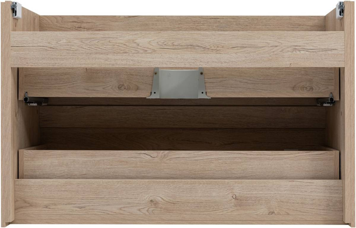Кроме того, надёжные навесы, способные выдерживать нагрузки до 130 кг, обеспечивают уверенную поддержку раковины и всего оборудования. Внутреннее пространство тумбы организовано с умом: выдвижные ящики из ВЛДСП имеют прочное дно и направляющие частичного выдвижения, что делает их идеальными для хранения туалетных принадлежностей. Специальная пластиковая вставка под сифон в сером цвете завершает функционал тумбы, сохраняя при этом чистоту и порядок в ванной комнате.