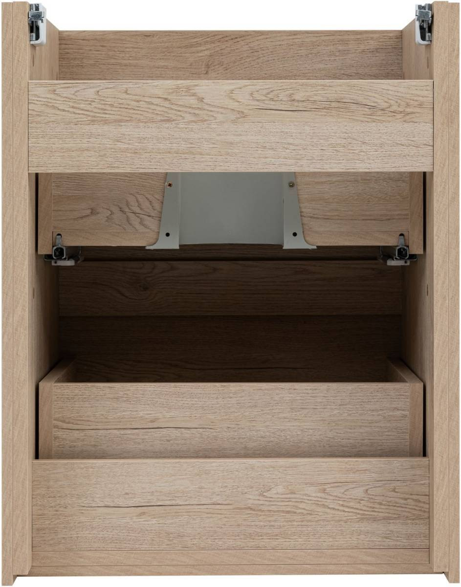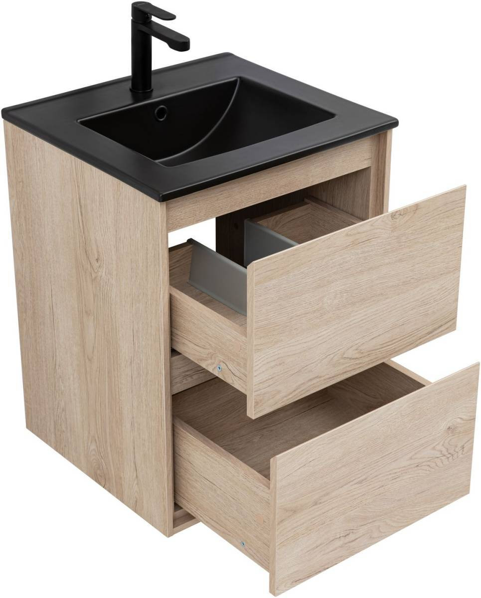 Кроме того, надёжные навесы, способные выдерживать нагрузки до 130 кг, обеспечивают уверенную поддержку раковины и всего оборудования. Внутреннее пространство тумбы организовано с умом: выдвижные ящики из ВЛДСП имеют прочное дно и направляющие частичного выдвижения, что делает их идеальными для хранения туалетных принадлежностей. Специальная пластиковая вставка под сифон в сером цвете завершает функционал тумбы, сохраняя при этом чистоту и порядок в ванной комнате.