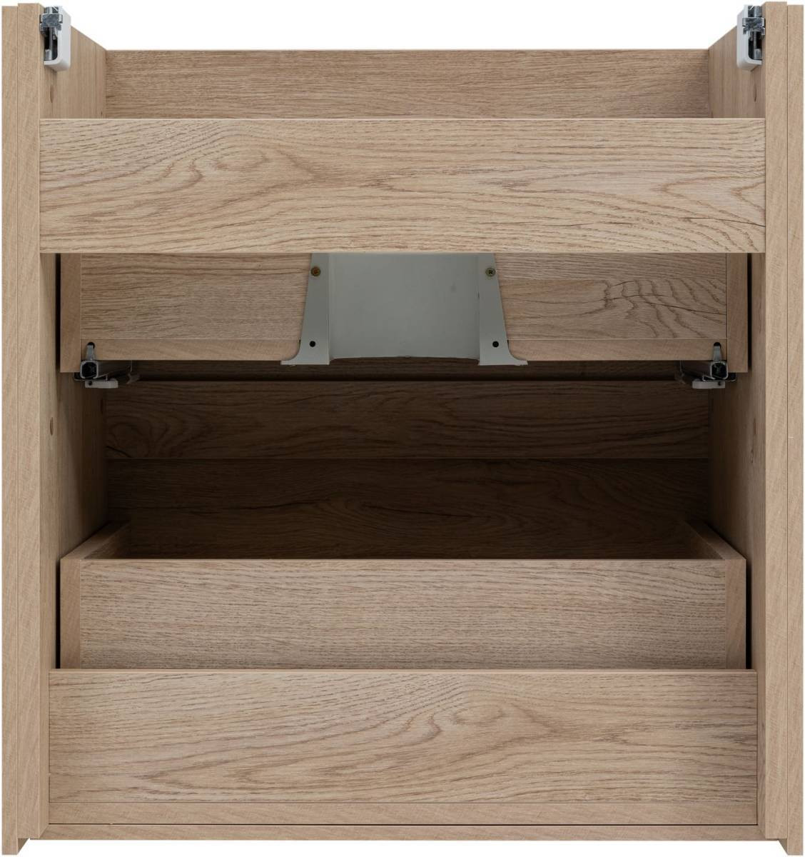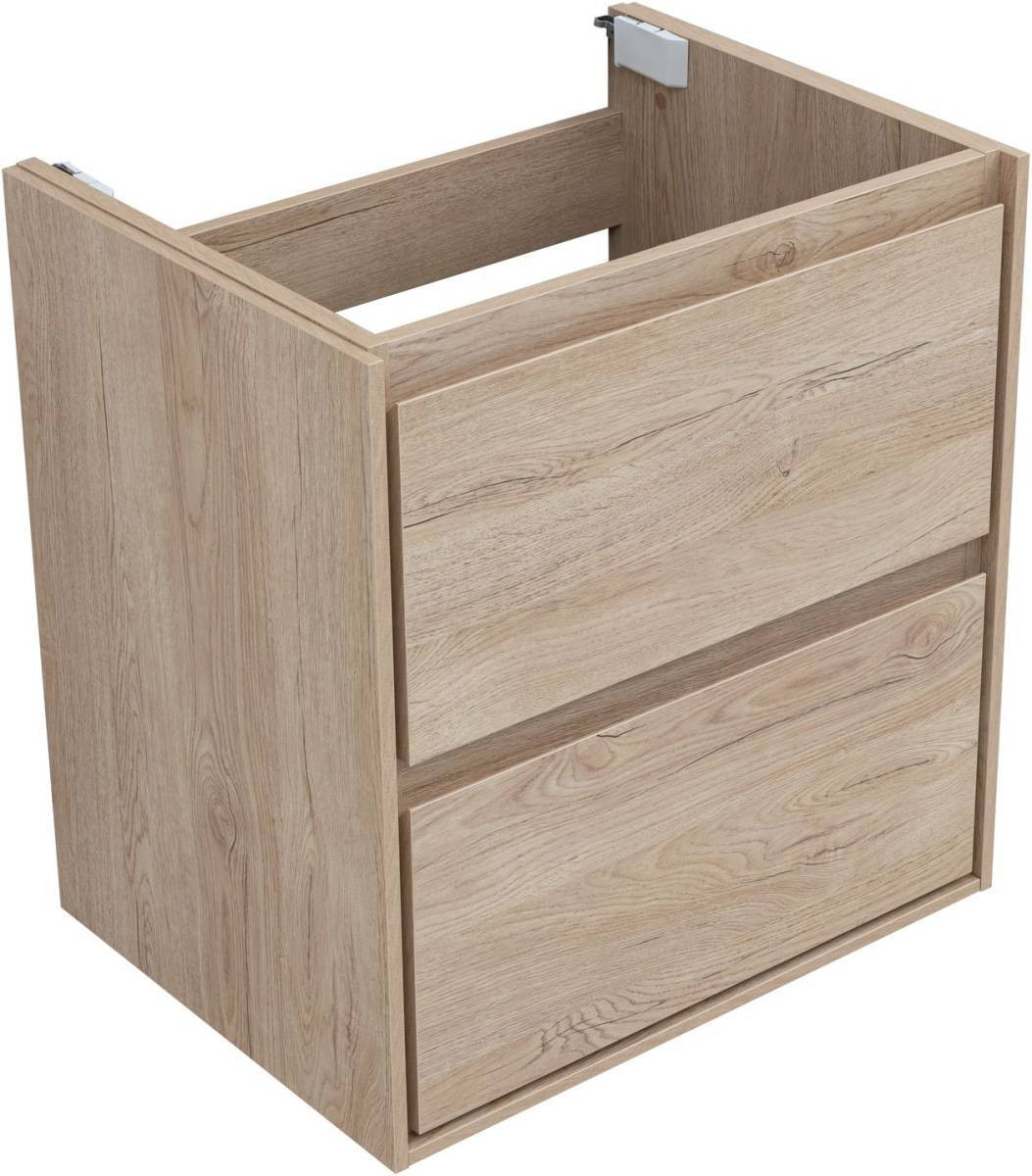 Кроме того, надёжные навесы, способные выдерживать нагрузки до 130 кг, обеспечивают уверенную поддержку раковины и всего оборудования. Внутреннее пространство тумбы организовано с умом: выдвижные ящики из ВЛДСП имеют прочное дно и направляющие частичного выдвижения, что делает их идеальными для хранения туалетных принадлежностей. Специальная пластиковая вставка под сифон в сером цвете завершает функционал тумбы, сохраняя при этом чистоту и порядок в ванной комнате.