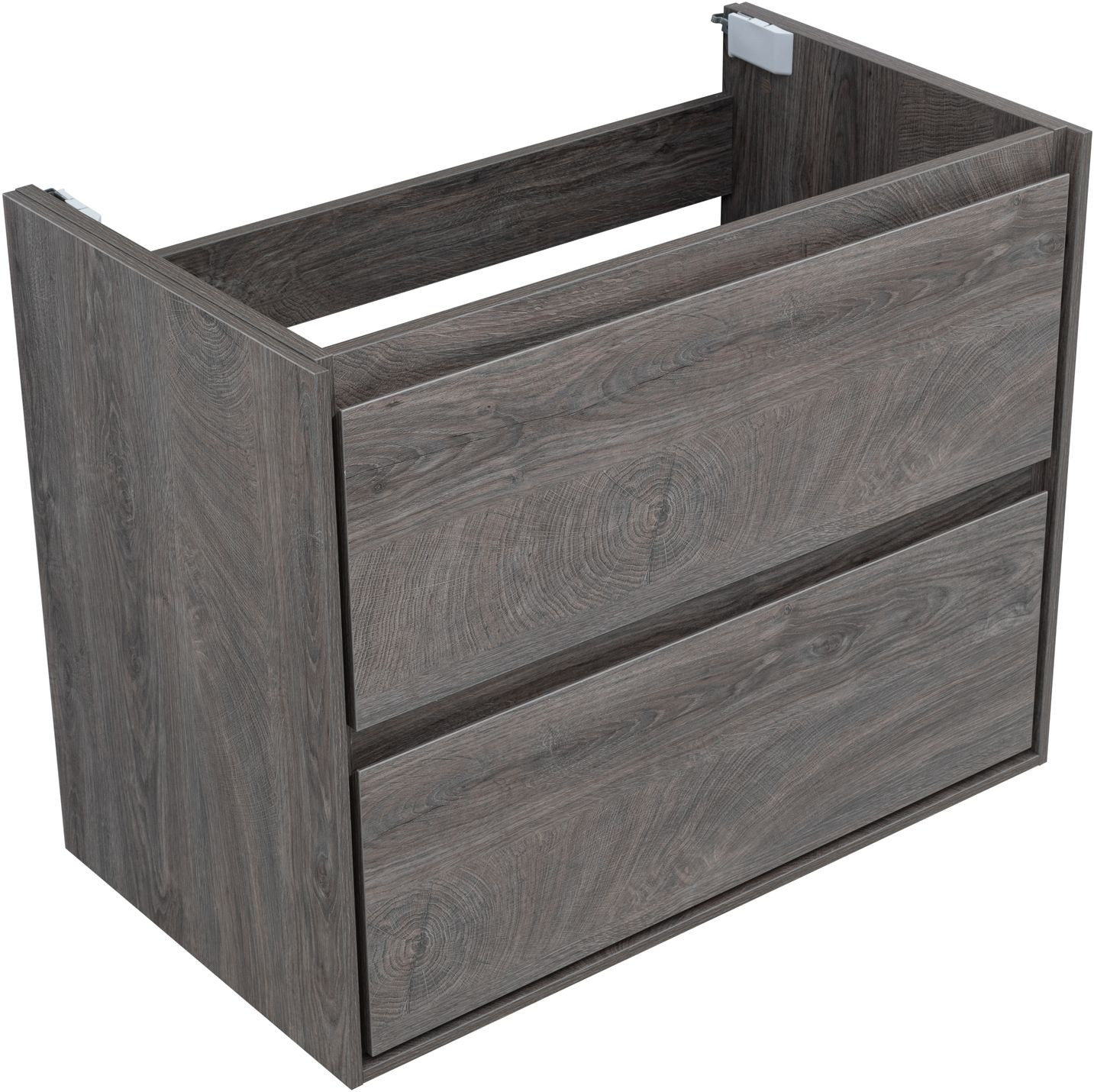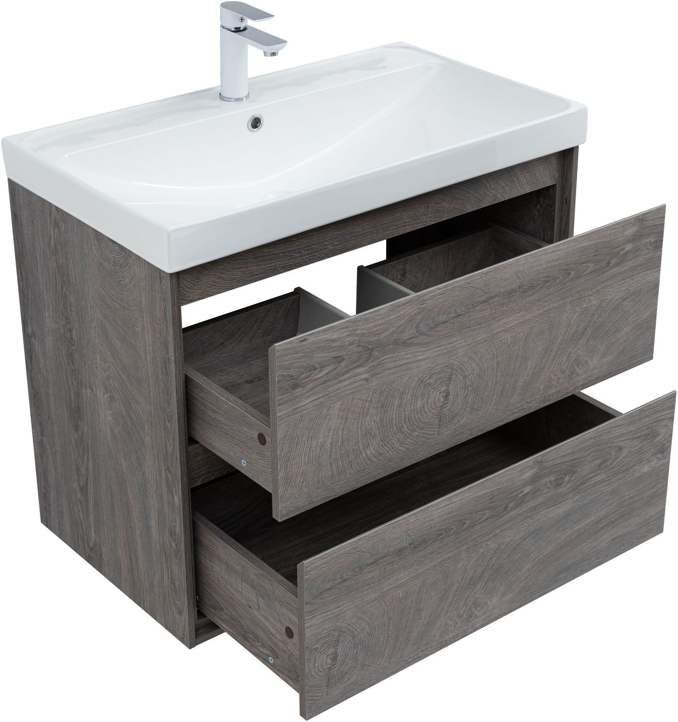 Кроме того, надёжные навесы, способные выдерживать нагрузки до 130 кг, обеспечивают уверенную поддержку раковины и всего оборудования. Внутреннее пространство тумбы организовано с умом: выдвижные ящики из ВЛДСП имеют прочное дно и направляющие частичного выдвижения, что делает их идеальными для хранения туалетных принадлежностей. Специальная пластиковая вставка под сифон в сером цвете завершает функционал тумбы, сохраняя при этом чистоту и порядок в ванной комнате.