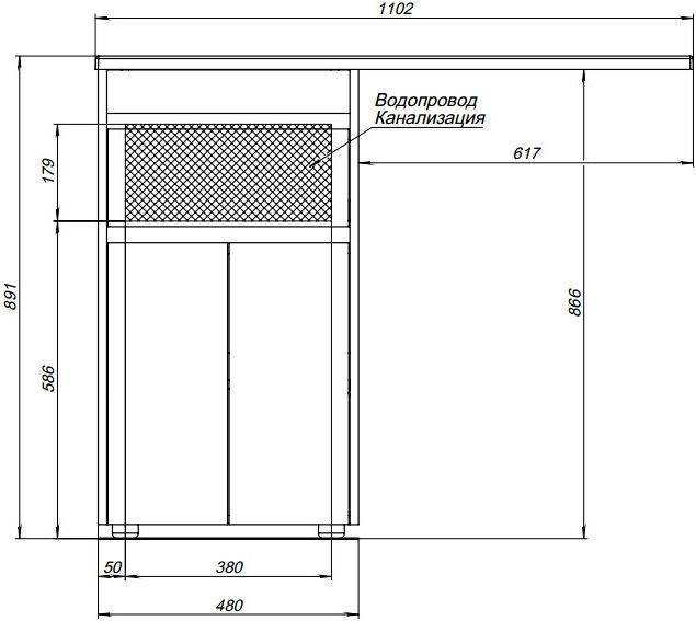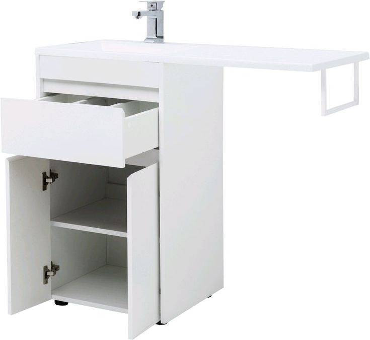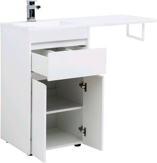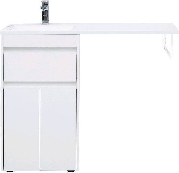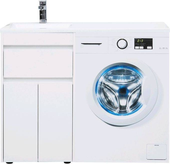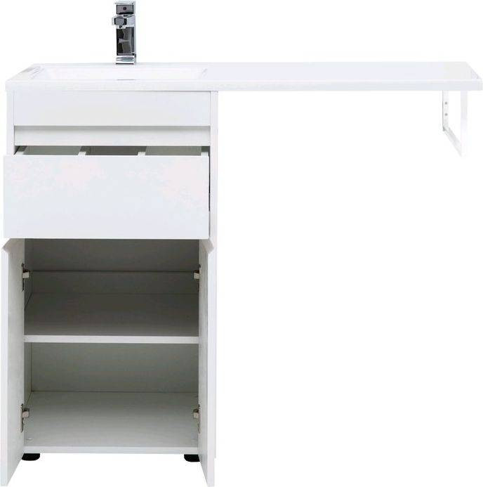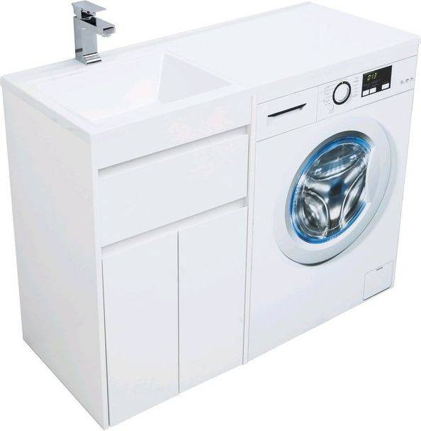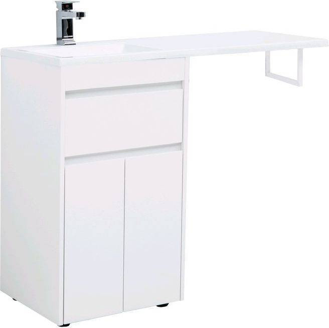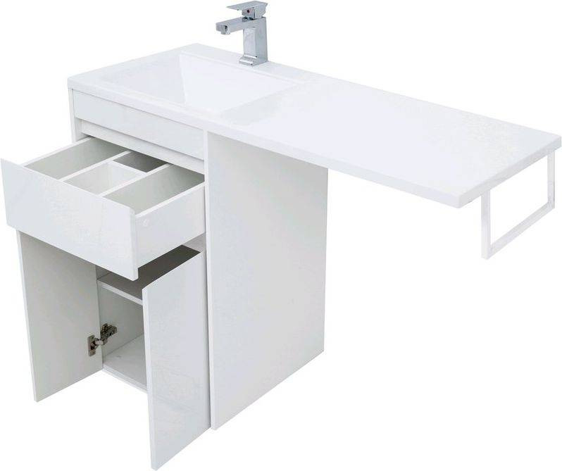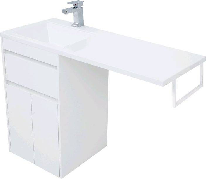 Тумба с раковиной Aquanet Токио 110 L (напольная, 1 ящик, 2 дверцы) белого цвета представляет новый формат тумб производства Aquanet. Раковина из литьевого мрамора имеет длинную платформу, которая выходит далеко за пределы тумбы. Она предназначена для того, чтобы установить с правой стороны от тумбы стиральную машину. Платформа имеет такую длину, которая позволит спрятать под нее машинку средних размеров с фронтальной загрузкой. Корпус тумбы выполнен из влагостойкого ЛДСП, а фасады – из МДФ с покрытием эмалью. Разнообразные зоны хранения в тумбе шириной 480 мм скрыты в ящике и за распашными дверками. Тумбу можно использовать и без соседства со стиральной машиной, а свободное пространство под платформой раковины занять подкатной тумбой, приспособлениями для уборки помещения или столиком.