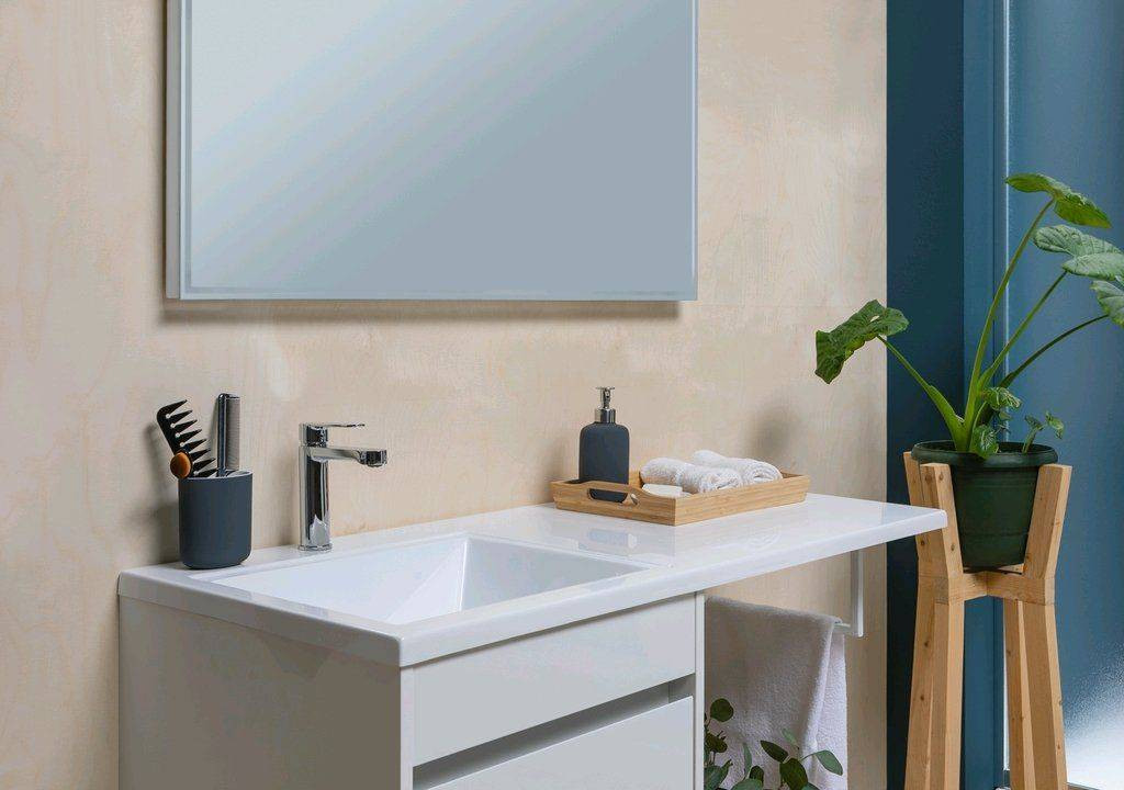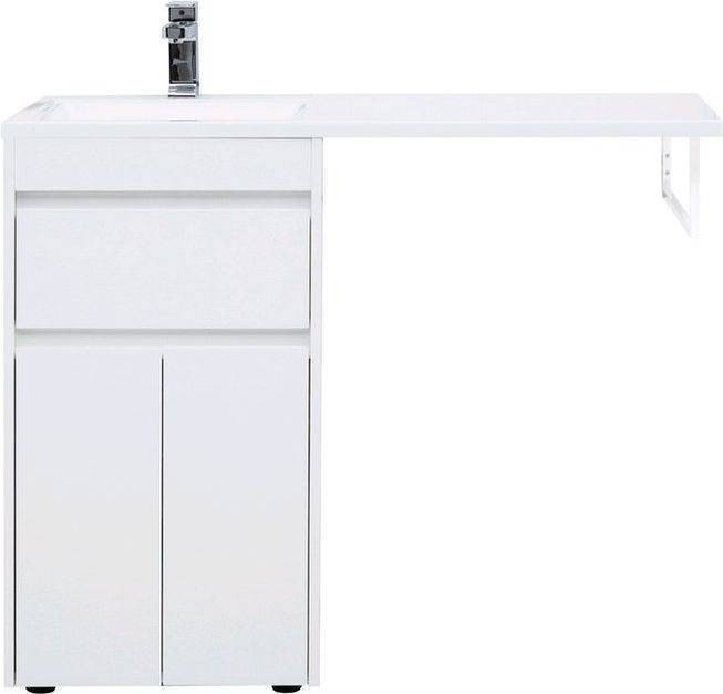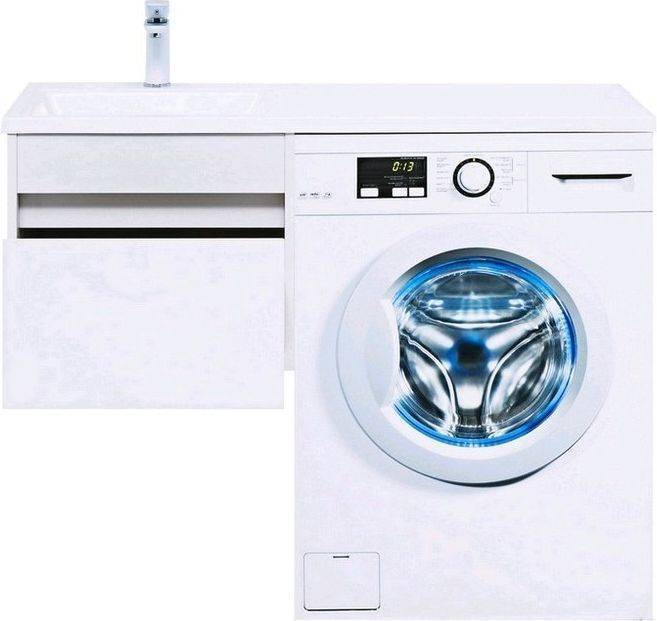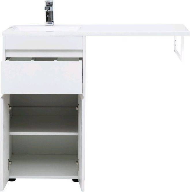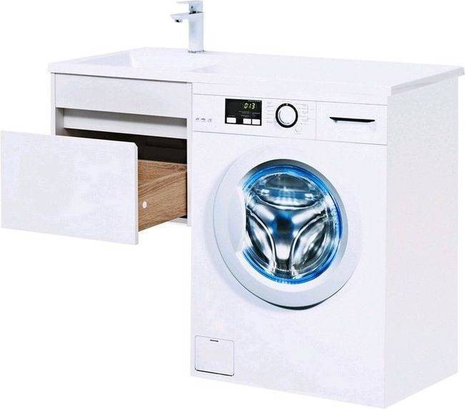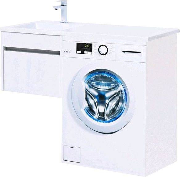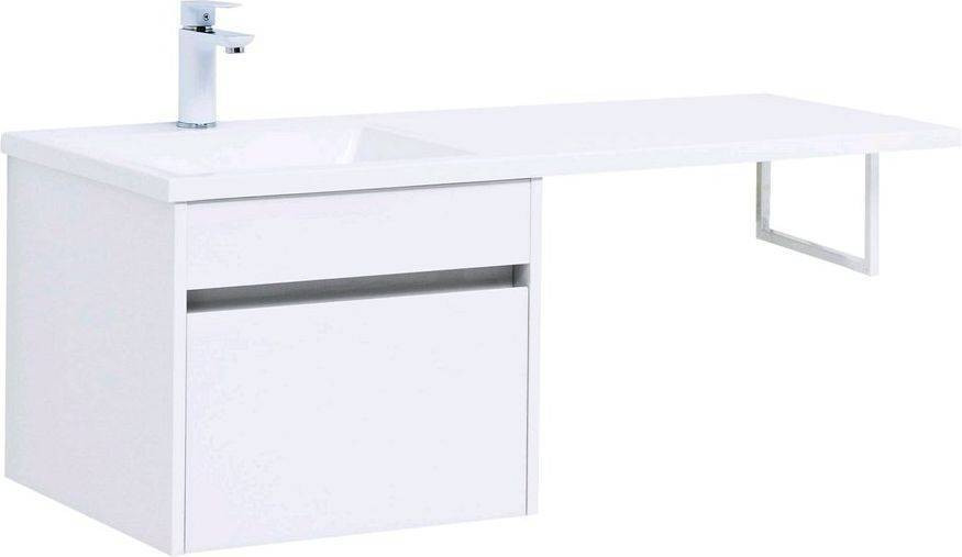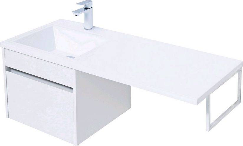 Тумба с раковиной Aquanet Токио 110 L (подвесная, 1 ящик) белого цвета представляет новый формат тумб производства Aquanet. Раковина из литьевого мрамора имеет длинную платформу, которая выходит далеко за пределы тумбы. Она предназначена для того, чтобы установить с правой стороны от тумбы стиральную машину. Платформа имеет такую длину, которая позволит спрятать под нее машинку средних размеров с фронтальной загрузкой. Корпус тумбы выполнен из влагостойкого ЛДСП, а фасад – из МДФ с покрытием эмалью. В подвесной тумбе шириной 480 мм место хранения предусмотрено в выдвижном ящике, оборудованном доводчиками, чтобы ход ящика при открывании/закрывании был плавным и без неприятных звуков. Тумбу можно использовать и без соседства со стиральной машиной, а свободное пространство под платформой раковины занять подкатной тумбой, полочками для полотенец или столиком.