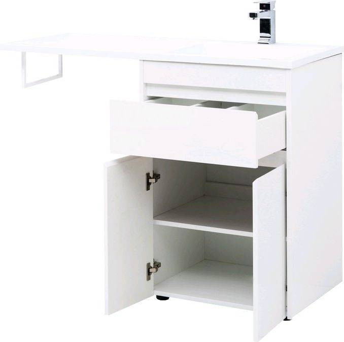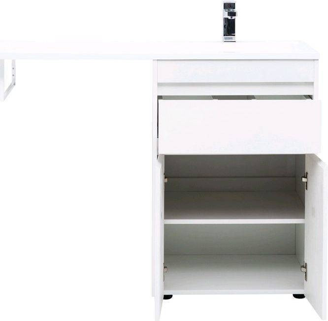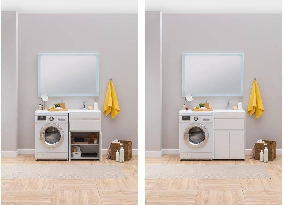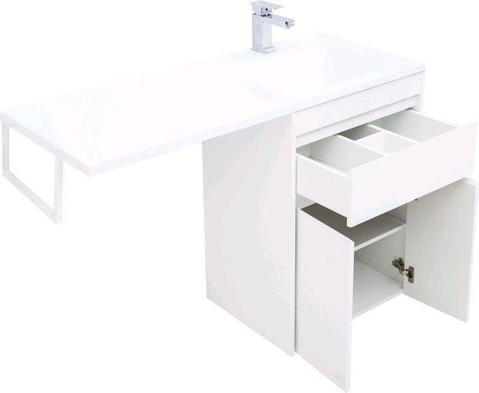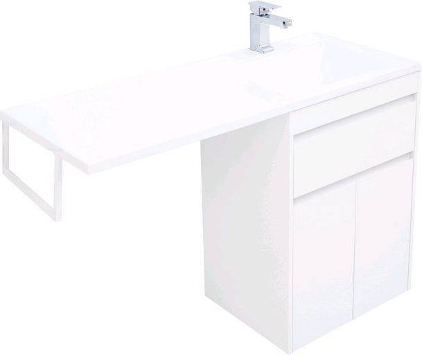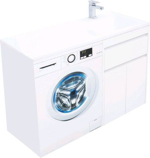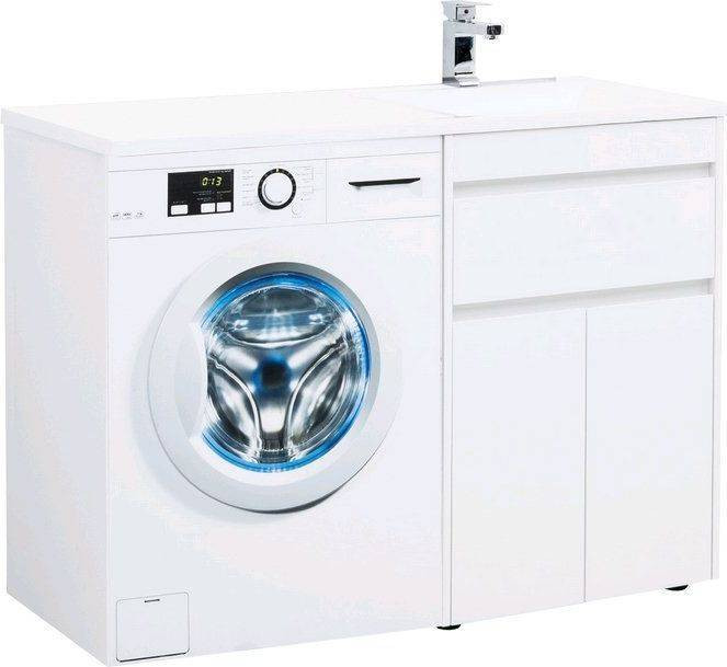 Тумба с раковиной Aquanet Токио 120 R (напольная, 1 ящик, 2 дверцы) белого цвета представляет новый формат тумб производства Aquanet. Раковина из литьевого мрамора имеет длинную платформу, которая выходит далеко за пределы тумбы. Она предназначена для того, чтобы установить с левой стороны от тумбы стиральную машину. Платформа имеет такую длину, которая позволит спрятать под нее машинку средних размеров с фронтальной загрузкой. Корпус тумбы выполнен из влагостойкого ЛДСП, а фасады – из МДФ с покрытием эмалью. Разнообразные зоны хранения в тумбе шириной 580 мм скрыты в ящике и за распашными дверками. Тумбу можно использовать и без соседства со стиральной машиной, а свободное пространство под платформой раковины занять подкатной тумбой, приспособлениями для уборки помещения или столиком.