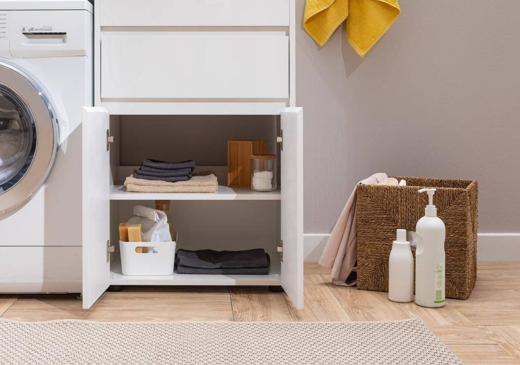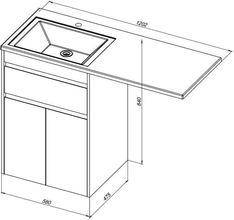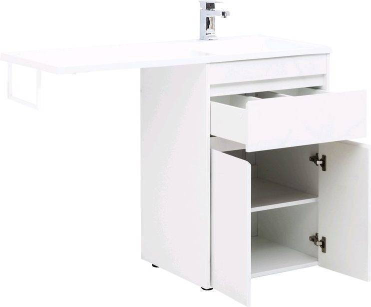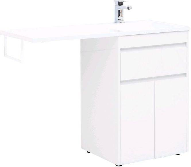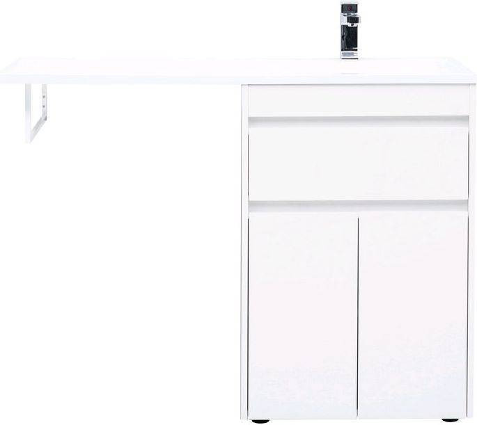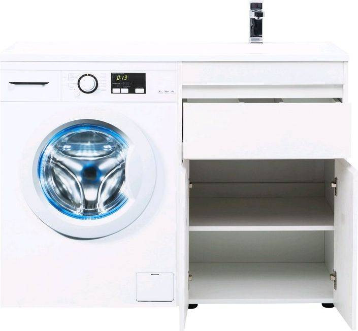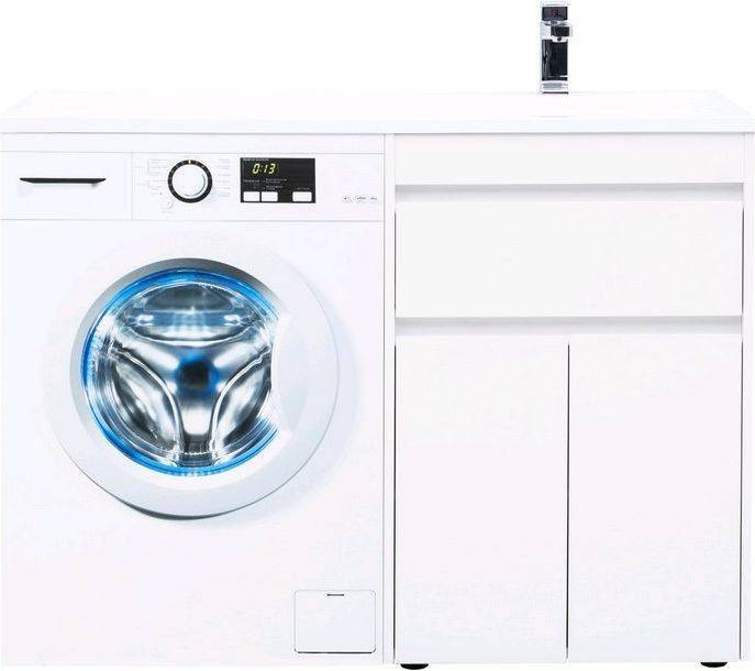 Тумба с раковиной Aquanet Токио 120 R (напольная, 1 ящик, 2 дверцы) белого цвета представляет новый формат тумб производства Aquanet. Раковина из литьевого мрамора имеет длинную платформу, которая выходит далеко за пределы тумбы. Она предназначена для того, чтобы установить с левой стороны от тумбы стиральную машину. Платформа имеет такую длину, которая позволит спрятать под нее машинку средних размеров с фронтальной загрузкой. Корпус тумбы выполнен из влагостойкого ЛДСП, а фасады – из МДФ с покрытием эмалью. Разнообразные зоны хранения в тумбе шириной 580 мм скрыты в ящике и за распашными дверками. Тумбу можно использовать и без соседства со стиральной машиной, а свободное пространство под платформой раковины занять подкатной тумбой, приспособлениями для уборки помещения или столиком.