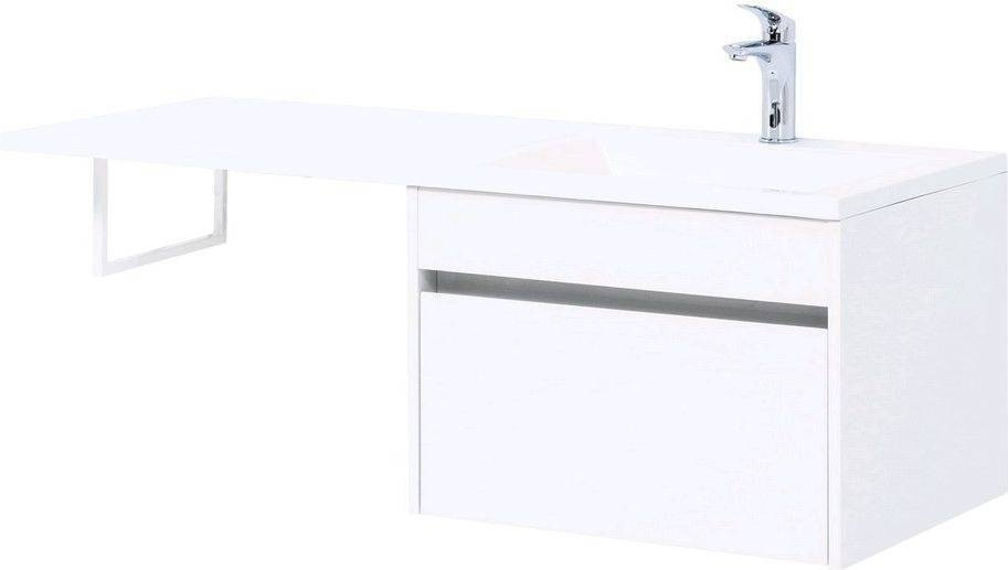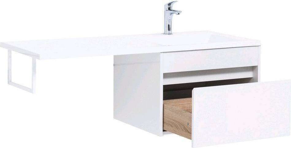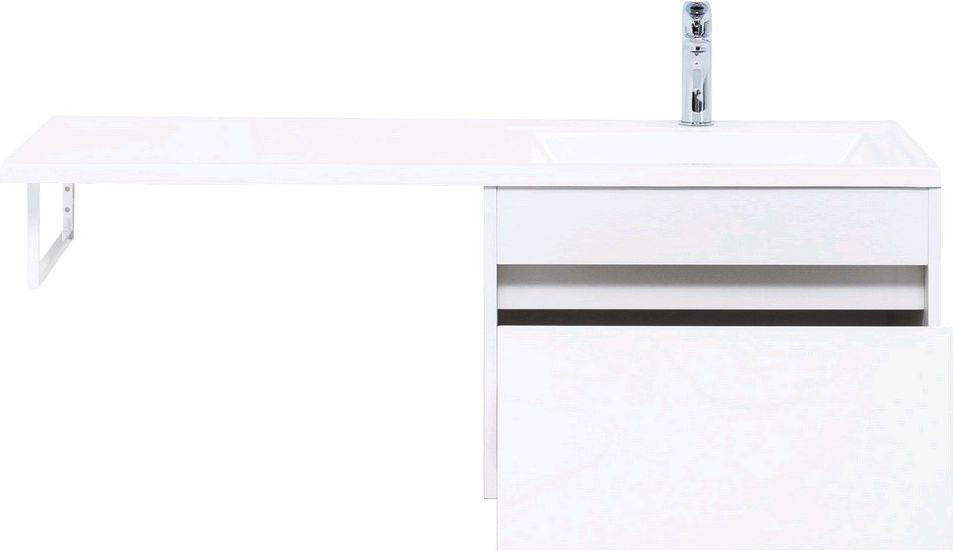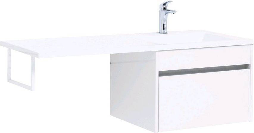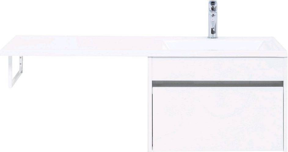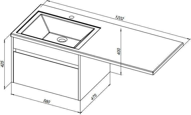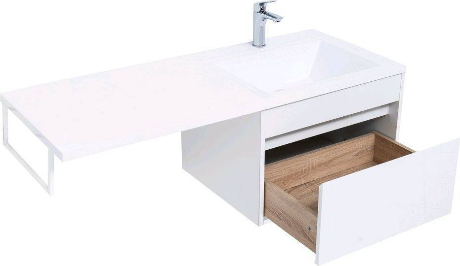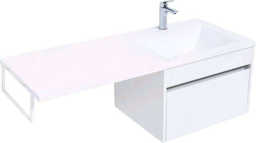 Тумба с раковиной Aquanet Токио 120 R (подвесная, 1 ящик) белого цвета представляет новый формат тумб производства Aquanet. Раковина из литьевого мрамора имеет длинную платформу, которая выходит далеко за пределы тумбы. Она предназначена для того, чтобы установить с левой стороны от тумбы стиральную машину. Платформа имеет такую длину, которая позволит спрятать под нее машинку средних размеров с фронтальной загрузкой. Корпус тумбы выполнен из влагостойкого ЛДСП, а фасад – из МДФ с покрытием эмалью. В подвесной тумбе шириной 580 мм место хранения предусмотрено в выдвижном ящике, оборудованном доводчиками, чтобы ход ящика при открывании/закрывании был плавным и без неприятных звуков. Тумбу можно использовать и без соседства со стиральной машиной, а свободное пространство под платформой раковины занять подкатной тумбой, полочками для полотенец или столиком.