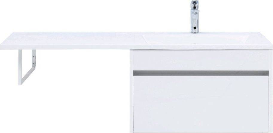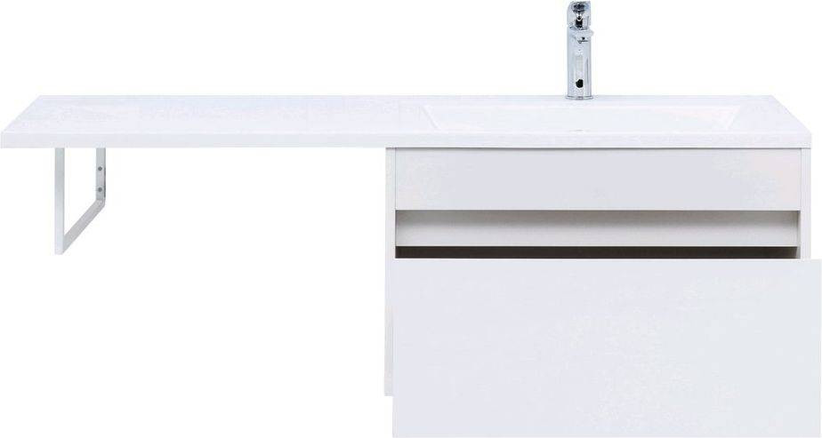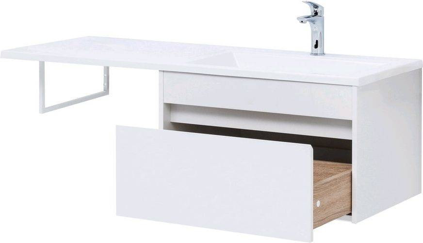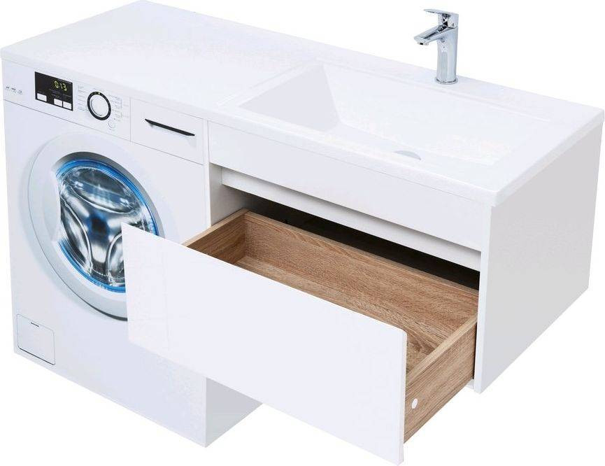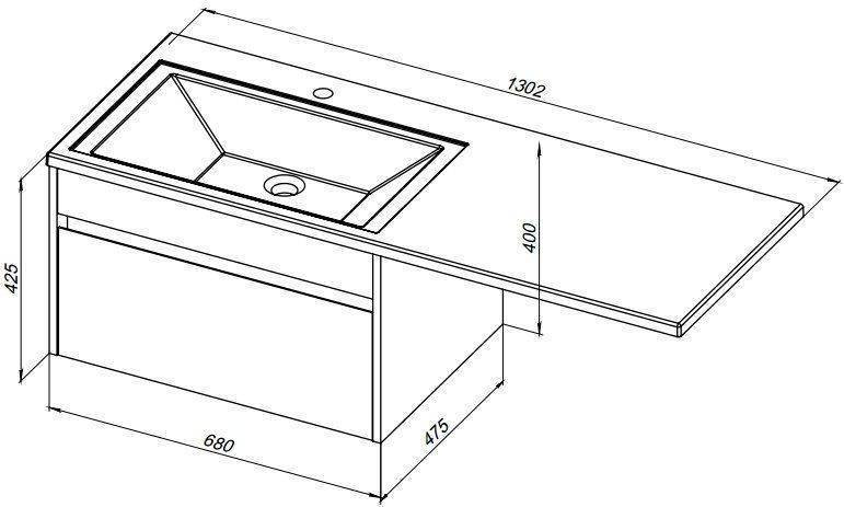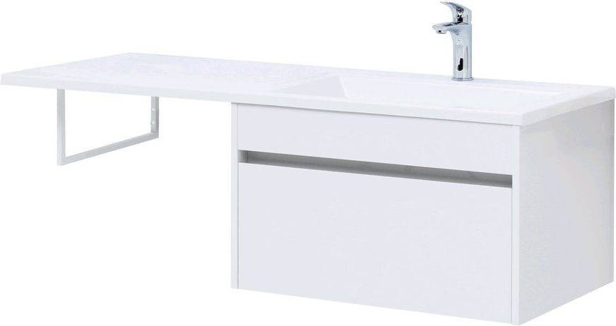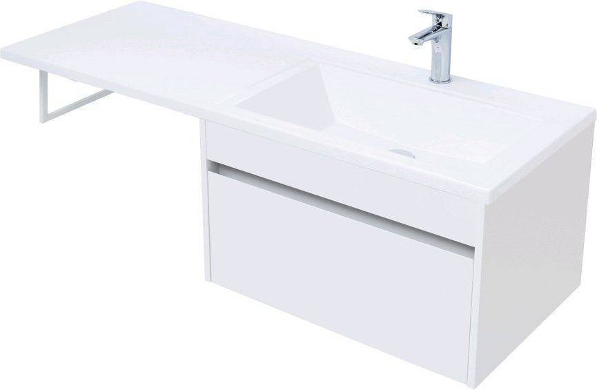Тумба с раковиной Aquanet Токио 130 R (подвесная, 1 ящик) белого цвета представляет новый формат тумб производства Aquanet. Раковина из литьевого мрамора имеет длинную платформу, которая выходит далеко за пределы тумбы. Она предназначена для того, чтобы установить с левой стороны от тумбы стиральную машину. Платформа имеет такую длину, которая позволит спрятать под нее машинку средних размеров с фронтальной загрузкой. Корпус тумбы выполнен из влагостойкого ЛДСП, а фасад – из МДФ с покрытием эмалью. В подвесной тумбе шириной 680 мм место хранения предусмотрено в выдвижном ящике, оборудованном доводчиками, чтобы ход ящика при открывании/закрывании был плавным и без неприятных звуков. Тумбу можно использовать и без соседства со стиральной машиной, а свободное пространство под платформой раковины занять подкатной тумбой, полочками для полотенец или столиком.
