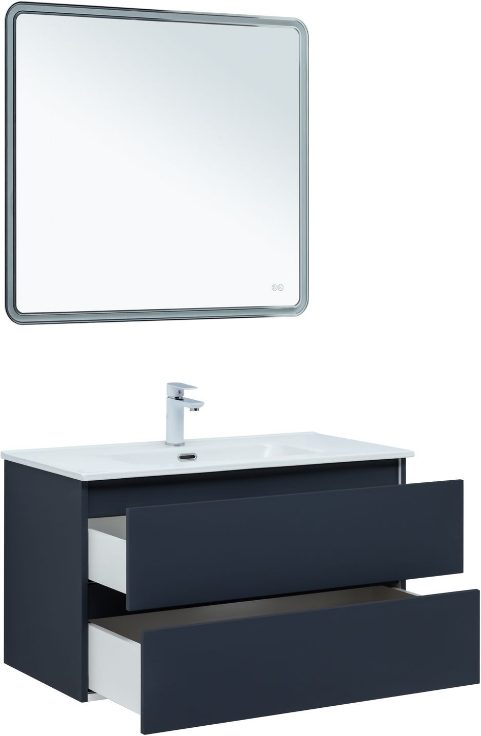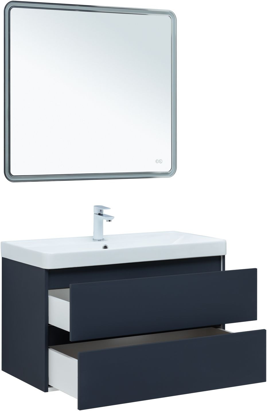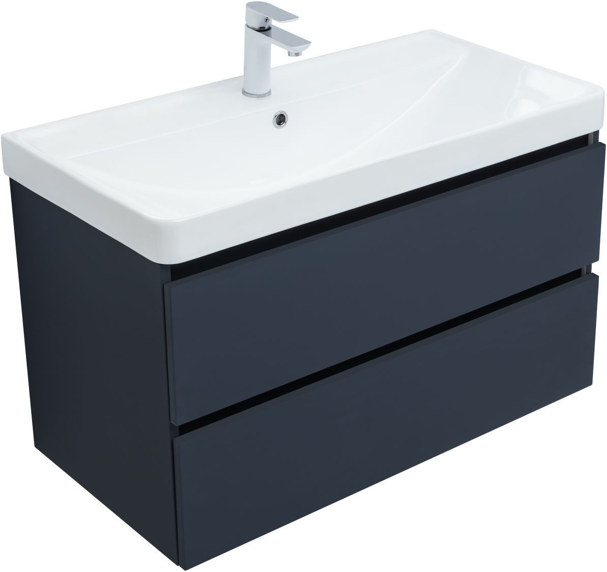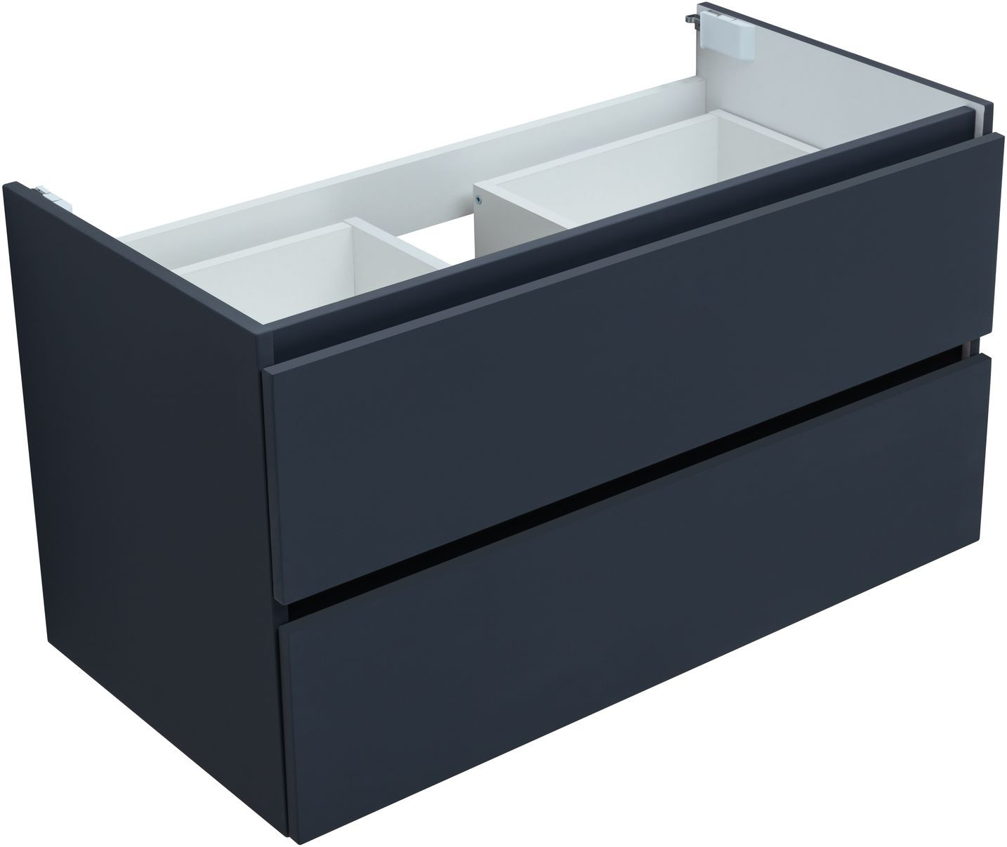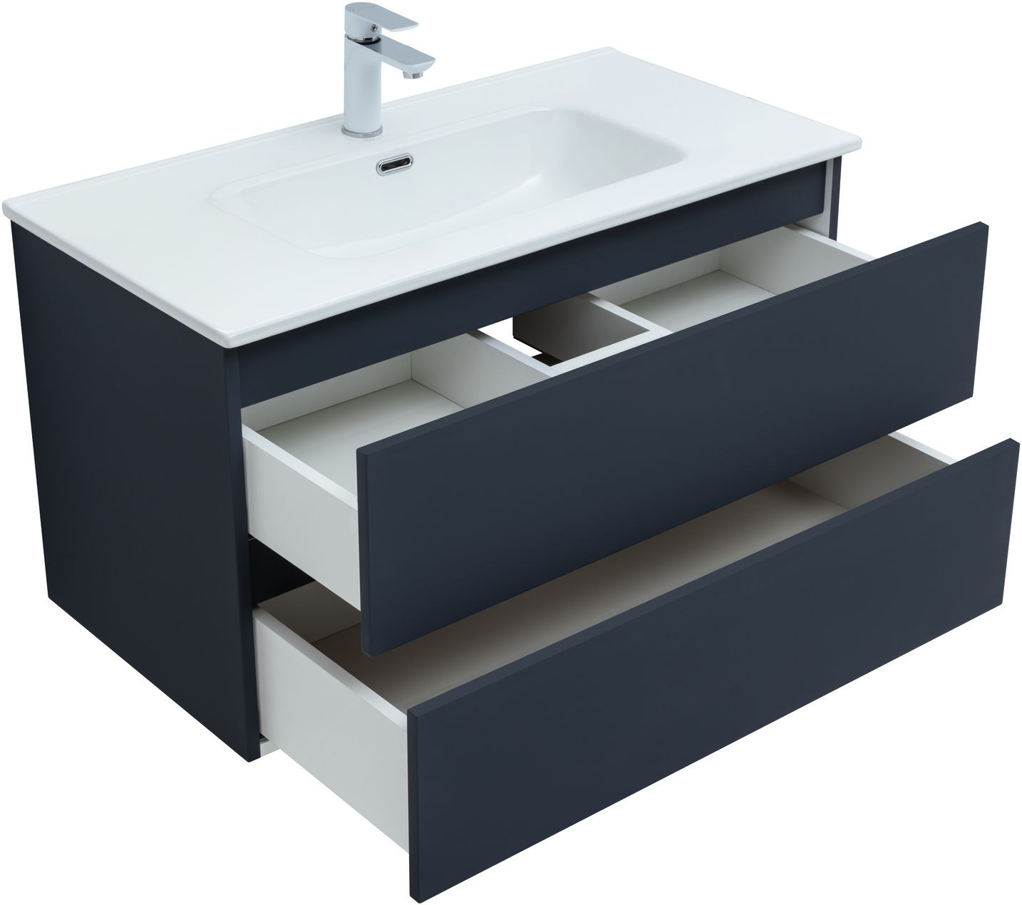 Фасады и корпуса из суперматовой пленки ПВХ обладают повышенной прочностью и эффектом «Soft touch», обеспечивая не только прекрасный внешний вид, но и приятные тактильные ощущения. Тумба оснащена двумя ящиками с механизмом доводчика, что обеспечивает плавное и бесшумное закрытие, а также высокую функциональность.