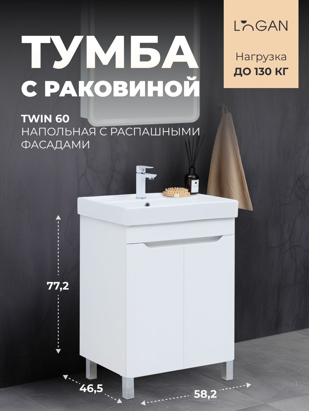 Тумба с раковиной в ванную Logan Twin 60 см. В сборе - С раковиной - Распашной Фасад.