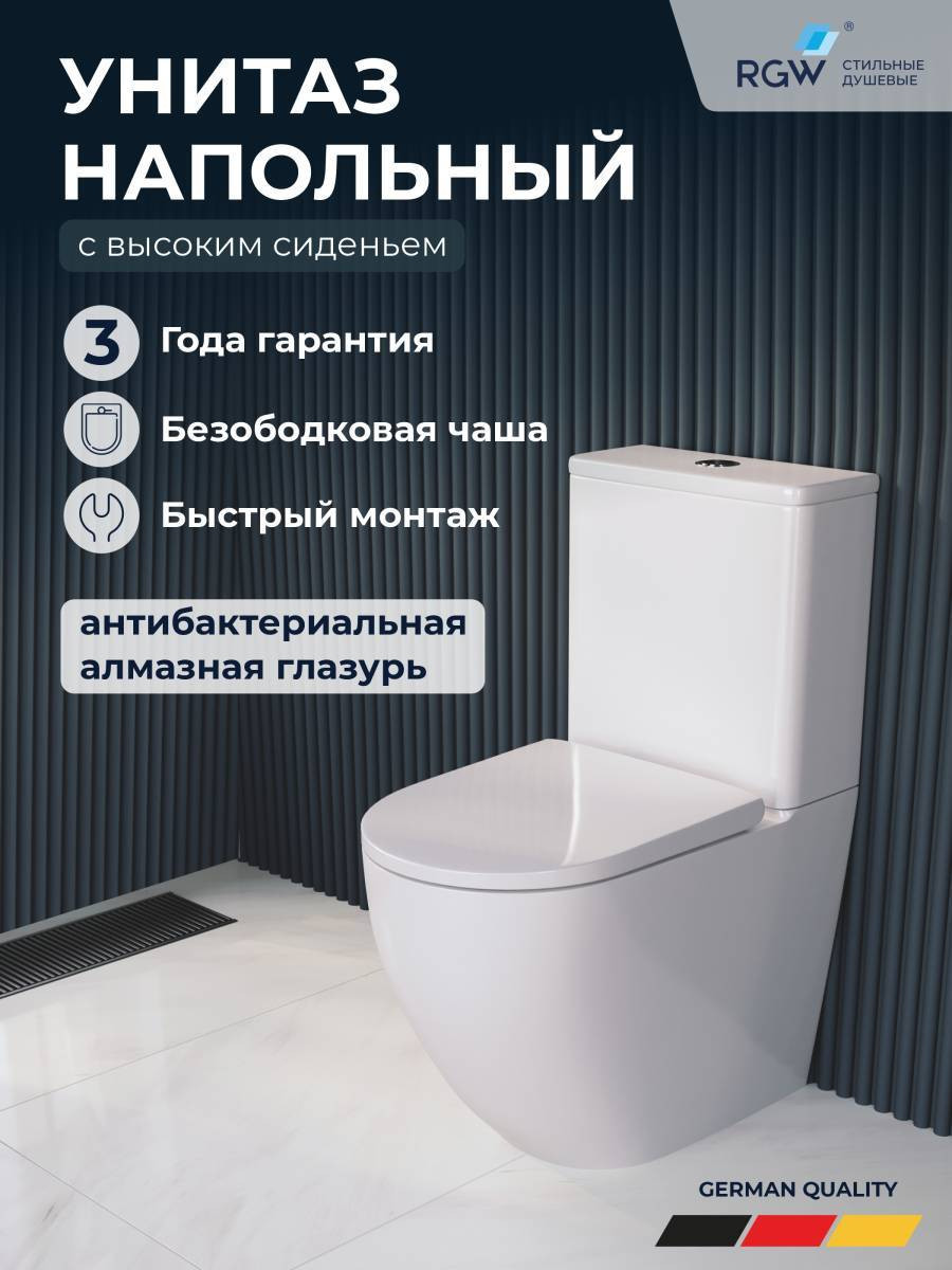 Унитаз с бачком напольный высокий обеспечивает эргономичную посадку.