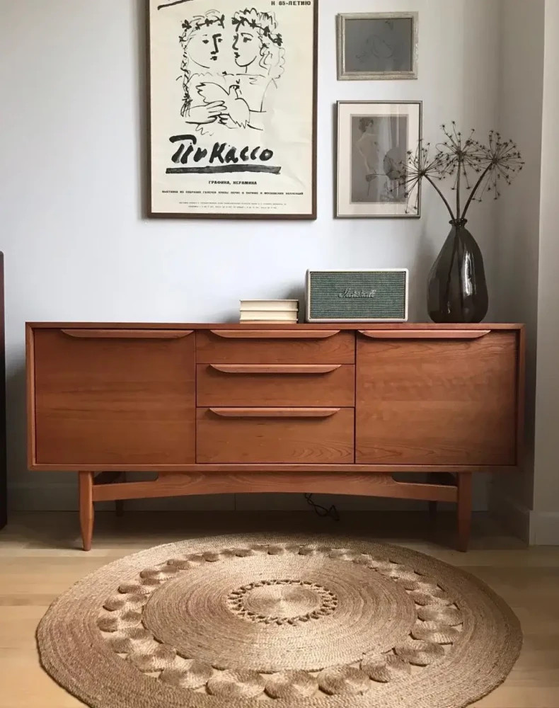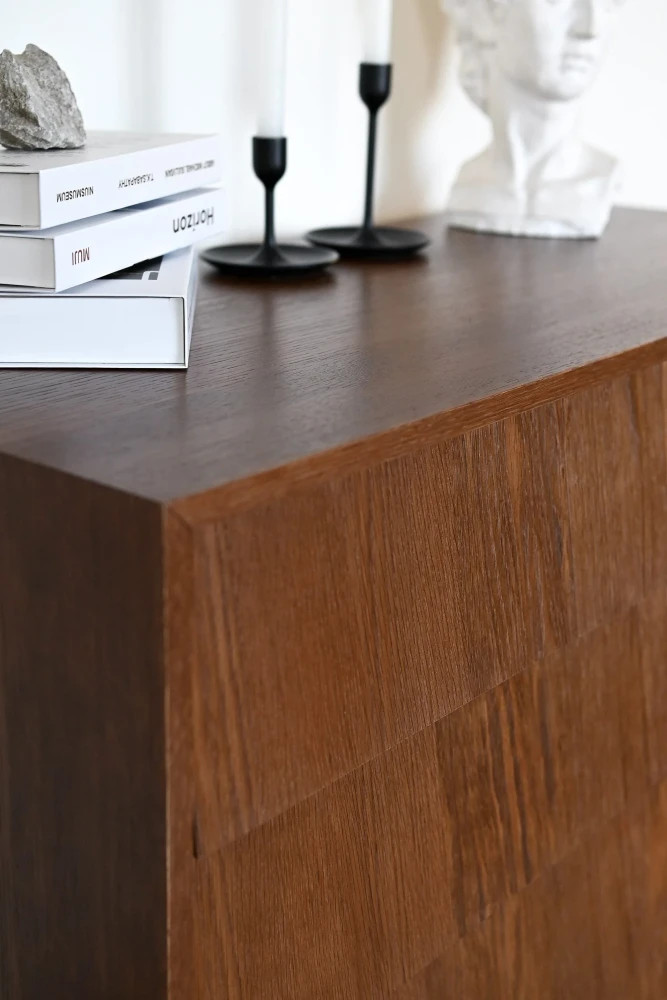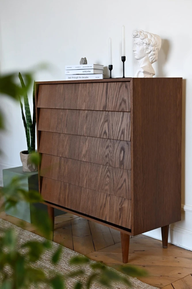 Универсальная система для хранения одежды, постельных принадлежностей или аксессуаров. 7 ящиков открываются с помощью направляющих скрытого монтажа. Металлическая фурнитура из латуни подчеркивает рисунок бука, а округлые ножки и угловатое основание придают комоду вид традиционного mid-century изделия.