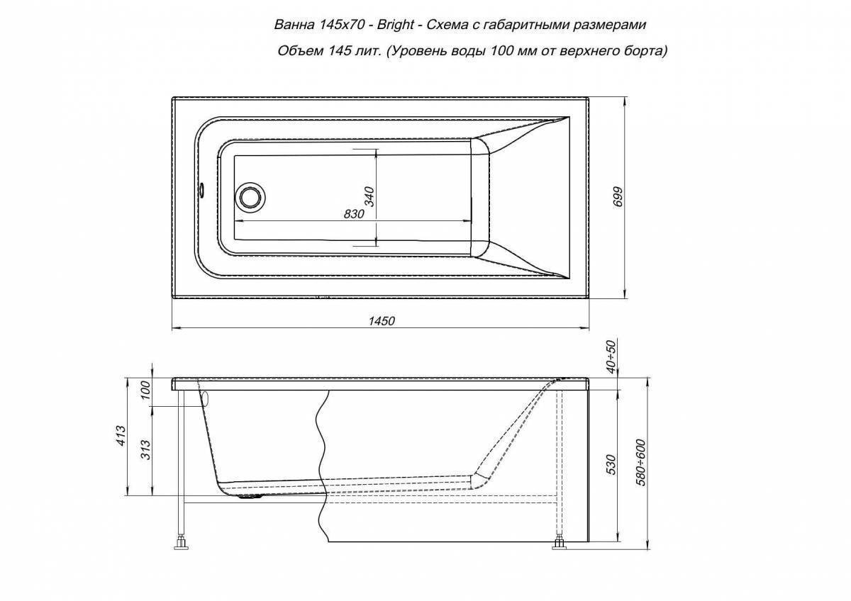 Акриловая ванна Aquanet Bright 145x70 создана с учетом растущего спроса на ванны простой прямоугольной формы в популярных размерах. Это модель с прямыми бортами и пологой спинкой, где соблюден идеальный угол для комфортного нахождения в ванне. Спинка плавно перетекает в бортик, поэтому релакс гарантирован даже без использования подголовника. Все линии ванны подчинены строгим законам эргономики. Ширина ванны 70 см при длине 145 см - это отличный вариант для крохотных ванных комнат. Чаша в этой ванне устроена таким образом, что для обозначенных размеров в ней достигнут максимально возможный внутренний объем, а именно 145 литров, и это при комфортной глубине в 413 мм от слива ванны до борта. Ванна рассчитана на нагрузку свыше 300 кг, так что даже крепкий мужчина сможет без опаски находиться в ней. Двойной слой армирования обеспечивает надежность чаши, а закладные из МДФ-плит в местах наибольшей нагрузки усиливают эффект.