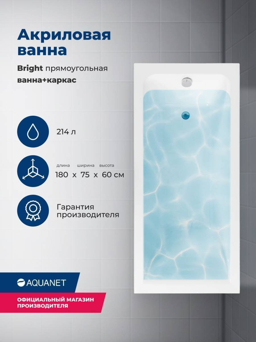 Акриловая ванна Aquanet Bright 180x75 создана с учетом растущего спроса на ванны простой прямоугольной формы в популярных размерах. Это модель с прямыми бортами и пологой спинкой, где соблюден идеальный угол для комфортного нахождения в ванне. Спинка плавно перетекает в бортик, поэтому релакс гарантирован даже без использования подголовника. Все линии ванны подчинены строгим законам эргономики. В современных условиях ширина ванны 75 см при длине 180 см - это наиболее востребованные габариты, так как прекрасно вписываются в стандартную планировку современных ванных комнат. Чаша в этой ванне устроена таким образом, что для обозначенных размеров в ней достигнут максимально возможный внутренний объем, а именно 214 литров. Ванна рассчитана на нагрузку свыше 300 кг, так что даже крепкий мужчина сможет без опаски находиться в ней. Двойной слой армирования обеспечивает надежность чаши, а закладные из МДФ-плит в местах наибольшей нагрузки усиливают эффект.