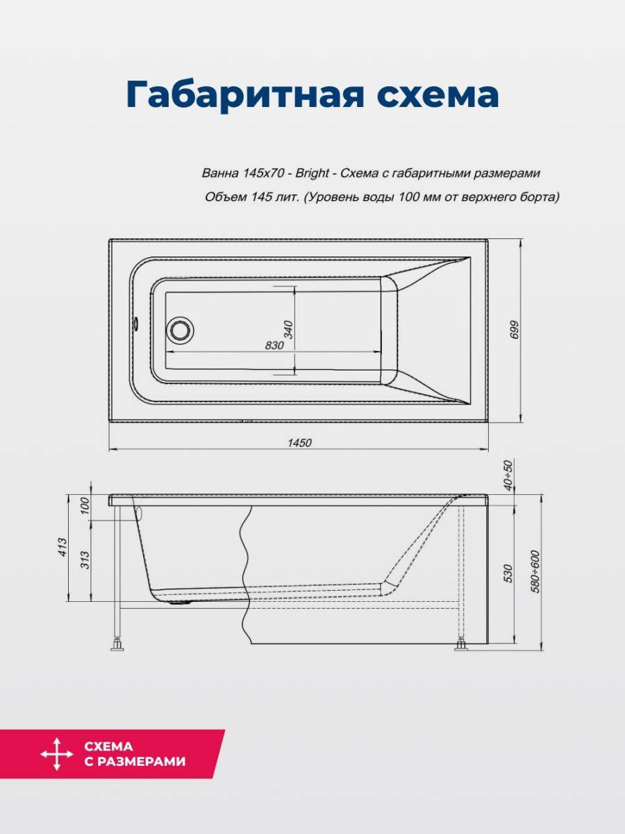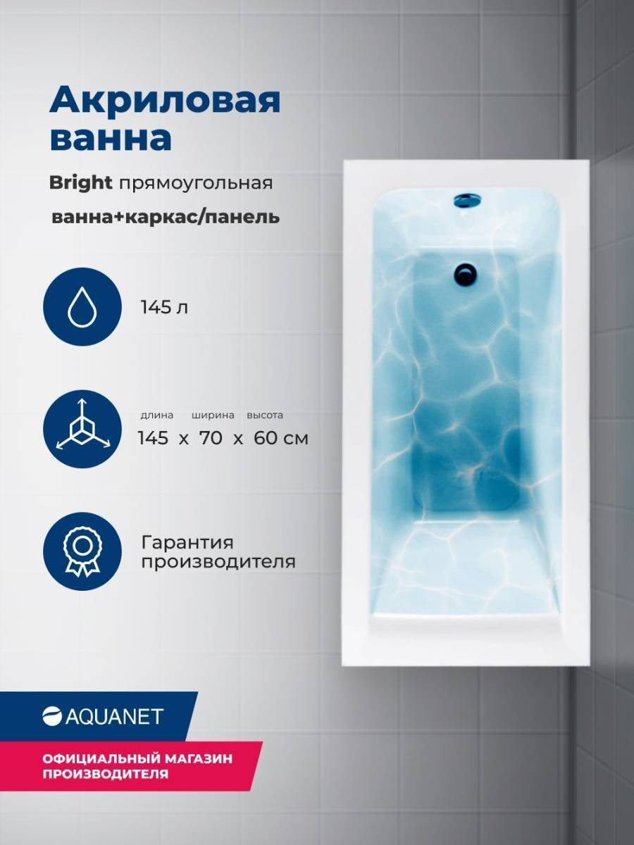 Обратите внимание, что это комплект: акриловая ванна, каркас и фронтальная панель. Акриловая ванна Aquanet Bright 145x70 создана с учетом растущего спроса на ванны простой прямоугольной формы в популярных размерах. Это модель с прямыми бортами и пологой спинкой, где соблюден идеальный угол для комфортного нахождения в ванне. Спинка плавно перетекает в бортик, поэтому релакс гарантирован даже без использования подголовника. Все линии ванны подчинены строгим законам эргономики. Ширина ванны 70 см при длине 145 см - это отличный вариант для крохотных ванных комнат. Чаша в этой ванне устроена таким образом, что для обозначенных размеров в ней достигнут максимально возможный внутренний объем, а именно 145 литров, и это при комфортной глубине в 413 мм от слива ванны до борта. Ванна рассчитана на нагрузку свыше 300 кг, так что даже крепкий мужчина сможет без опаски находиться в ней. Двойной слой армирования обеспечивает надежность чаши, а закладные из МДФ-плит в местах наибольшей нагрузки усиливают эффект.