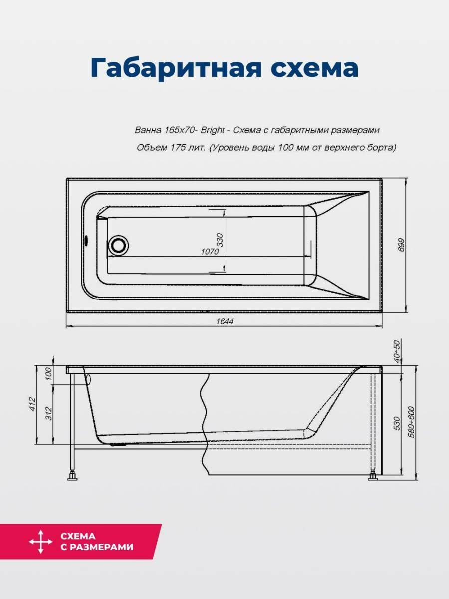 Обратите внимание, что это комплект: акриловая ванна, каркас и фронтальная панель. Акриловая ванна Aquanet Bright 165x70 создана с учетом растущего спроса на ванны простой прямоугольной формы в популярных размерах. Это модель с прямыми бортами и пологой спинкой, где соблюден идеальный угол для комфортного нахождения в ванне. Спинка плавно перетекает в бортик, поэтому релакс гарантирован даже без использования подголовника. Все линии ванны подчинены строгим законам эргономики. В современных условиях ширина ванны 70 см при длине 165 см - это наиболее востребованные габариты, так как прекрасно вписываются в стандартную планировку современных ванных комнат. Чаша в этой ванне устроена таким образом, что для обозначенных размеров в ней достигнут максимально возможный внутренний объем, а именно 175 литров, и это при комфортной глубине в 412 мм от слива ванны до борта. Ванна рассчитана на нагрузку свыше 300 кг, так что даже крепкий мужчина сможет без опаски находиться в ней. Двойной слой армирования обеспечивает надежность чаши, а закладные из МДФ-плит в местах наибольшей нагрузки усиливают эффект.