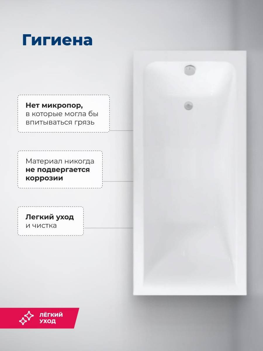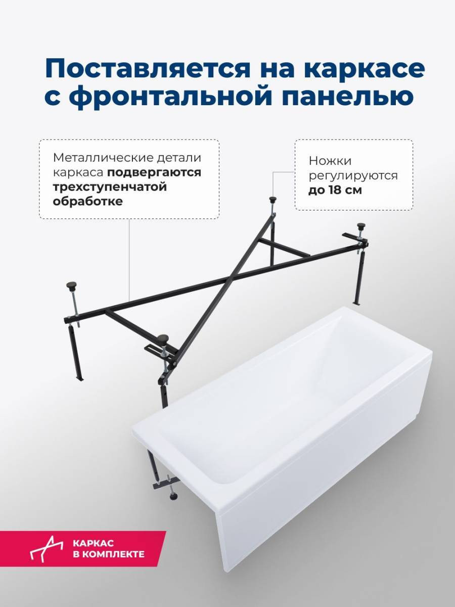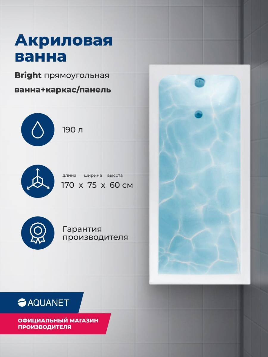Обратите внимание, что это комплект: акриловая ванна, каркас и фронтальная панель. Акриловая ванна Aquanet Bright 170x75 создана с учетом растущего спроса на ванны простой прямоугольной формы в популярных размерах. Это модель с прямыми бортами и пологой спинкой, где соблюден идеальный угол для комфортного нахождения в ванне. Спинка плавно перетекает в бортик, поэтому релакс гарантирован даже без использования подголовника. Все линии ванны подчинены строгим законам эргономики. В современных условиях ширина ванны 75 см при длине 170 см - одно из популярных габаритов, так как прекрасно вписываются в стандартную планировку современных ванных комнат. Чаша в этой ванне устроена таким образом, что для обозначенных размеров в ней достигнут максимально возможный внутренний объем, а именно 190 литров, и это при комфортной глубине в 403 мм от слива ванны до борта. Ванна рассчитана на нагрузку свыше 300 кг, так что даже крепкий мужчина сможет без опаски находиться в ней. Двойной слой армирования обеспечивает надежность чаши, а закладные из МДФ-плит в местах наибольшей нагрузки усиливают эффект.