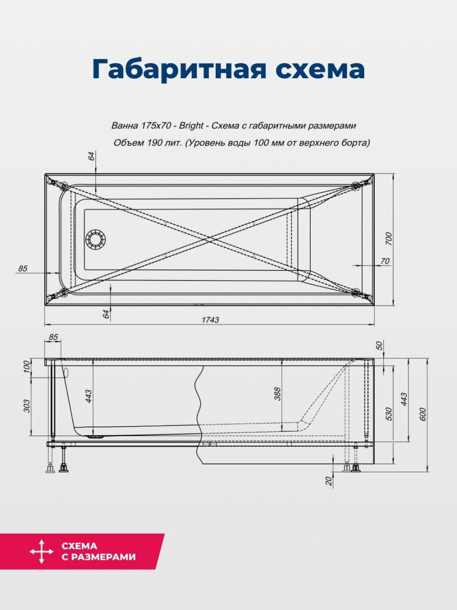Обратите внимание, что это комплект: акриловая ванна, каркас, фронтальная и боковая панели. Акриловая ванна Aquanet Bright 175x70 создана с учетом растущего спроса на ванны простой прямоугольной формы в популярных размерах. Это модель с прямыми бортами и пологой спинкой, где соблюден идеальный угол для комфортного нахождения в ванне. Спинка плавно перетекает в бортик, поэтому релакс гарантирован даже без использования подголовника. Все линии ванны подчинены строгим законам эргономики. В современных условиях ширина ванны 70 см при длине 175 см - это наиболее востребованные габариты, так как прекрасно вписываются в стандартную планировку современных ванных комнат. Чаша в этой ванне устроена таким образом, что для обозначенных размеров в ней достигнут максимально возможный внутренний объем, а именно 190 литров, и это при комфортной глубине в 393 мм от слива ванны до борта. Ванна рассчитана на нагрузку свыше 300 кг, так что даже крепкий мужчина сможет без опаски находиться в ней. Двойной слой армирования обеспечивает надежность чаши, а закладные из МДФ-плит в местах наибольшей нагрузки усиливают эффект.