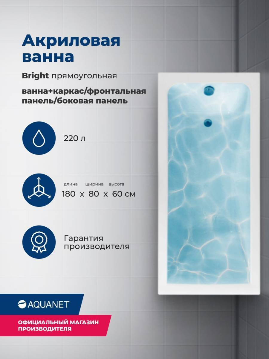 Обратите внимание, что это комплект: акриловая ванна, каркас, фронтальная и боковая панели. Акриловая ванна Aquanet Bright 180x80 создана с учетом растущего спроса на ванны простой прямоугольной формы в популярных размерах. Это модель с прямыми бортами и пологой спинкой, где соблюден идеальный угол для комфортного нахождения в ванне. Спинка плавно перетекает в бортик, поэтому релакс гарантирован даже без использования подголовника. Все линии ванны подчинены строгим законам эргономики. В современных условиях ширина ванны 80 см при длине 180 см - комфортные габариты, которые, к тому же, прекрасно вписываются в стандартную планировку современных ванных комнат. Чаша в этой ванне устроена таким образом, что для обозначенных размеров в ней достигнут максимально возможный внутренний объем, а именно 220 литров, и это при комфортной глубине в 411 мм от слива ванны до борта. Ванна рассчитана на нагрузку свыше 300 кг, так что даже крепкий мужчина сможет без опаски находиться в ней. Двойной слой армирования обеспечивает надежность чаши, а закладные из МДФ-плит в местах наибольшей нагрузки усиливают эффект.