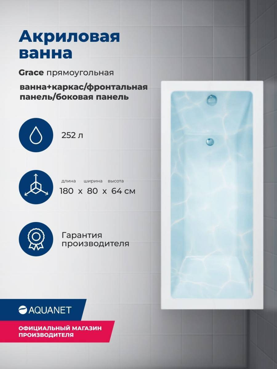 Обратите внимание, что это комплект: акриловая ванна, каркас, фронтальная и боковая панели. Акриловая ванна Aquanet Grace белого цвета отличается классической прямоугольной формой. Модель представлена в размере 180х80 см. Она органично впишется в дизайн современной ванной комнаты, оформленной в стилях модерн, минимализм или сканди. Корпус выполнен из акрила. Материал практически не скользит, хорошо поглощает звук от падающей из смесителя воды и достаточно легкий. Акрил не подвержен коррозии и не накапливает бактерии.