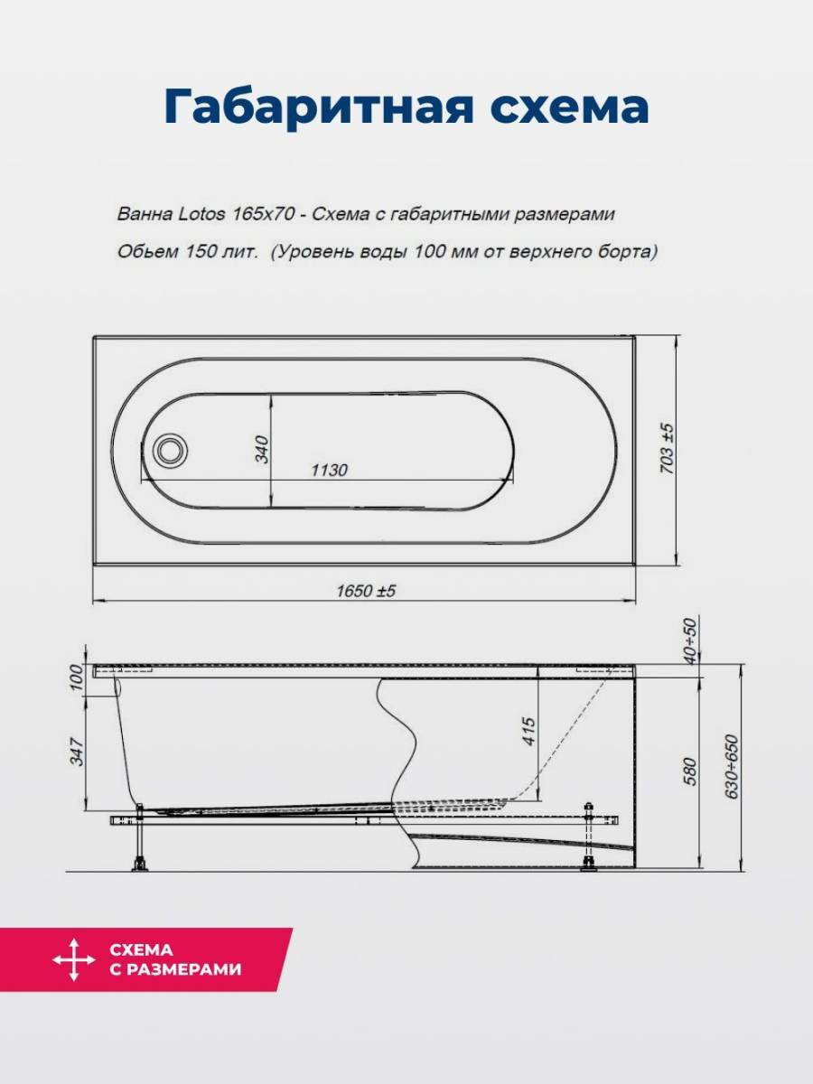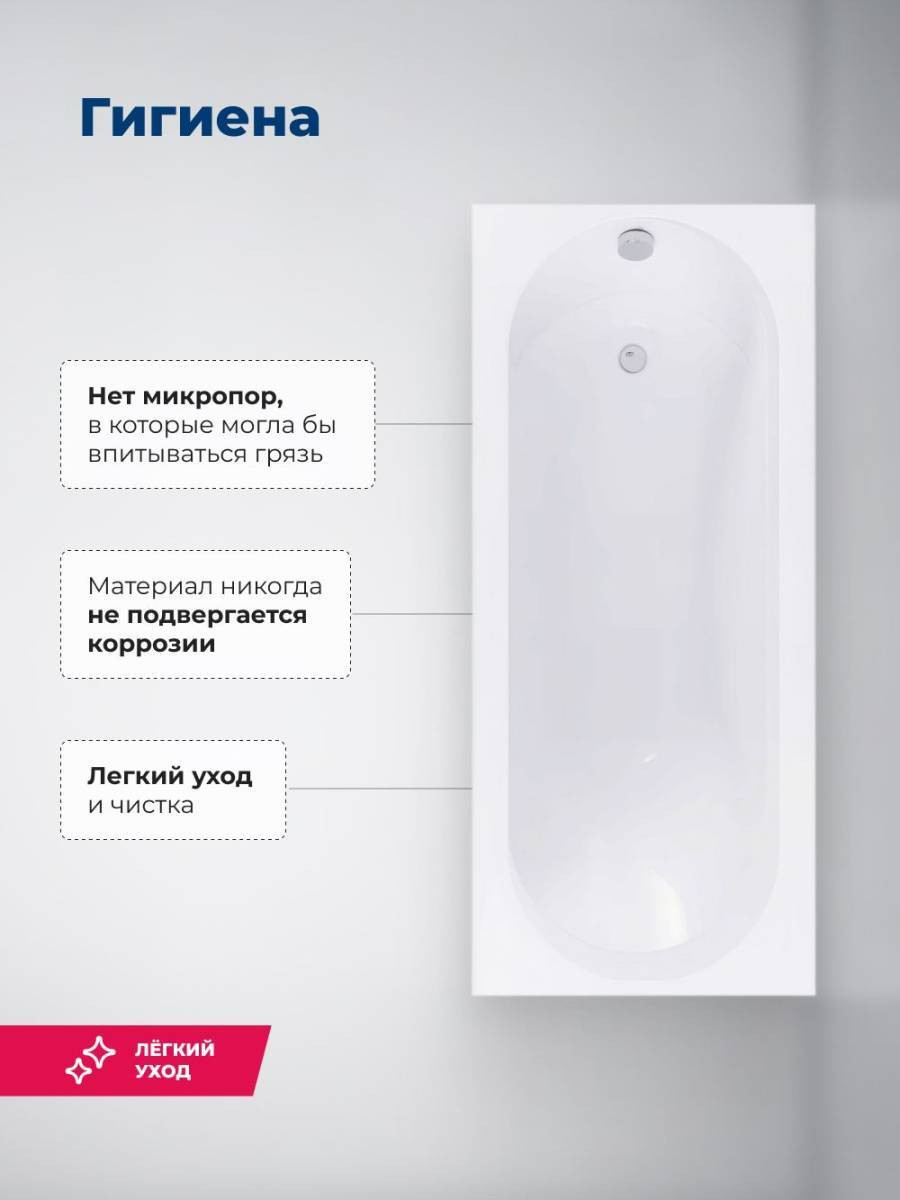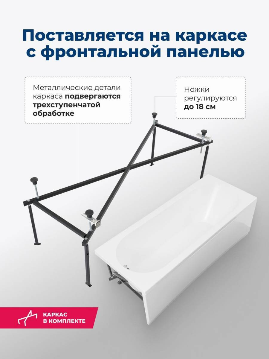 Овальная чаша объемом 150 л со стандартным сливом дополнена расположенной под углом спинкой, переходящей в прямые широкие бортики. Глубина составляет 44,7 см. Выверенная до мелочей эргономика обеспечивает комфортное принятие водных процедур, позволяет держать под рукой необходимые гигиенические принадлежности. Устойчивость придает прочный металлический каркас, оптимальную высоту которого можно подобрать за счет регулируемых ножек.