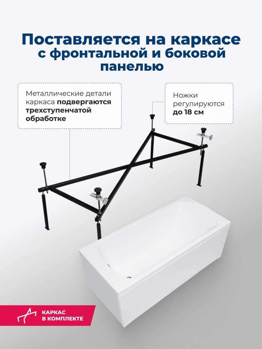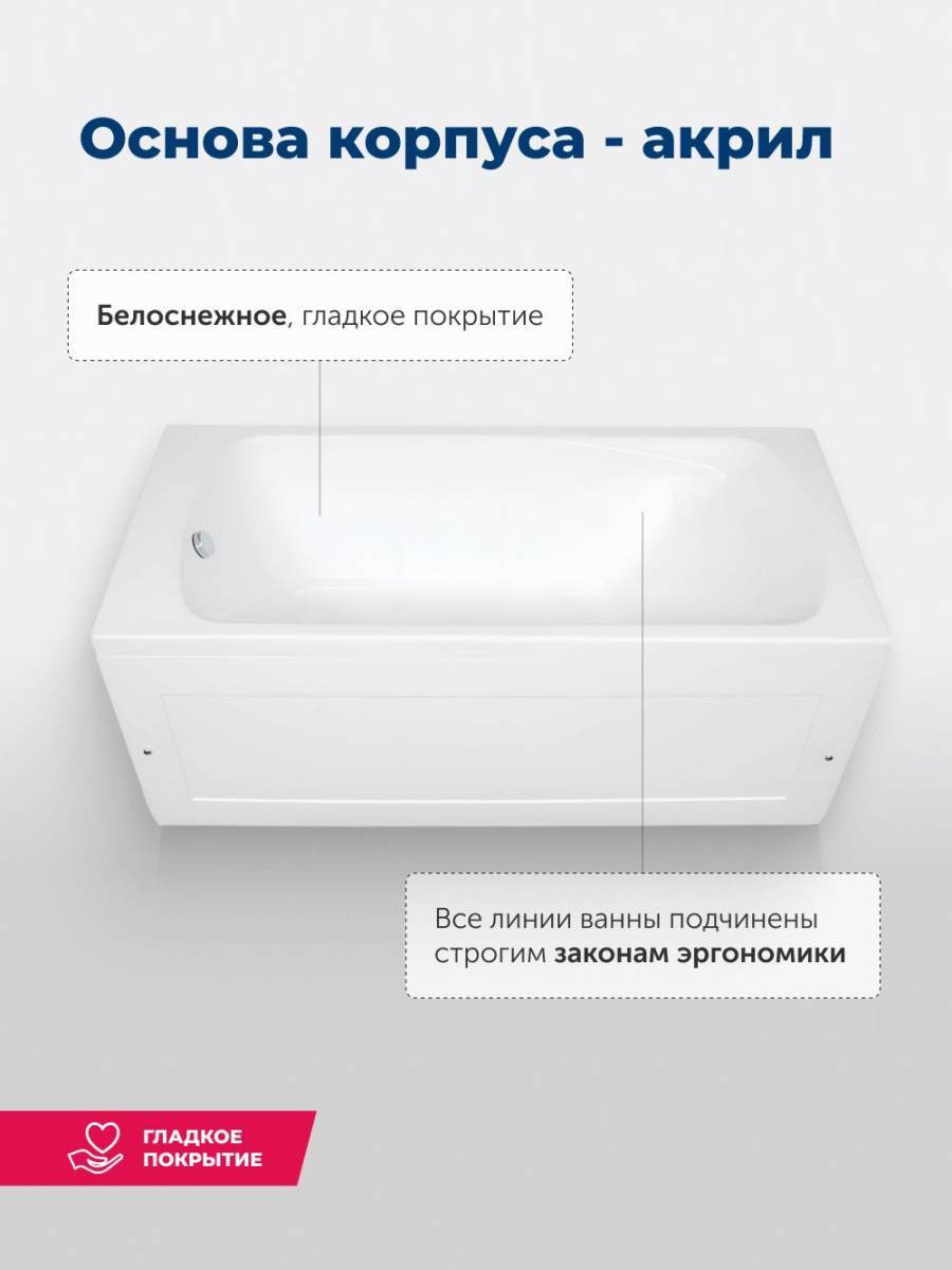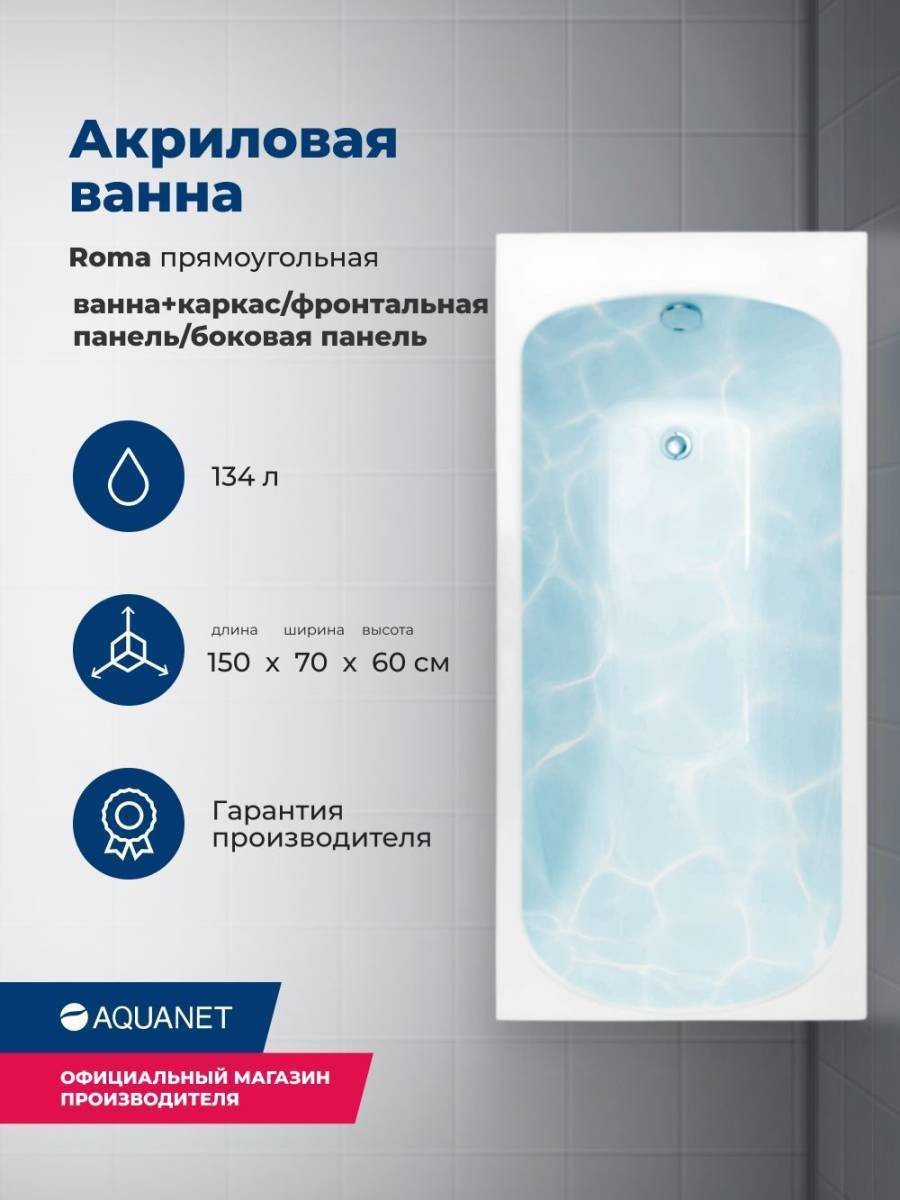 Обратите внимание, что это комплект: акриловая ванна, каркас, фронтальная и боковая панели. Ванна прямоугольная Aquanet Roma 150x70 выполнена в цвете «белый глянец» и имеет удобную форму. Ее глубина составляет 392 мм, благодаря чему ванна способна вместить в себя 134 литров воды. На днище ванны предусмотрено антискользящее покрытие, выполненное в виде небольших бугорков на поверхности. В изголовье предусмотрен подголовник. Прекрасный образец достойного качества в бюджетном воплощении.