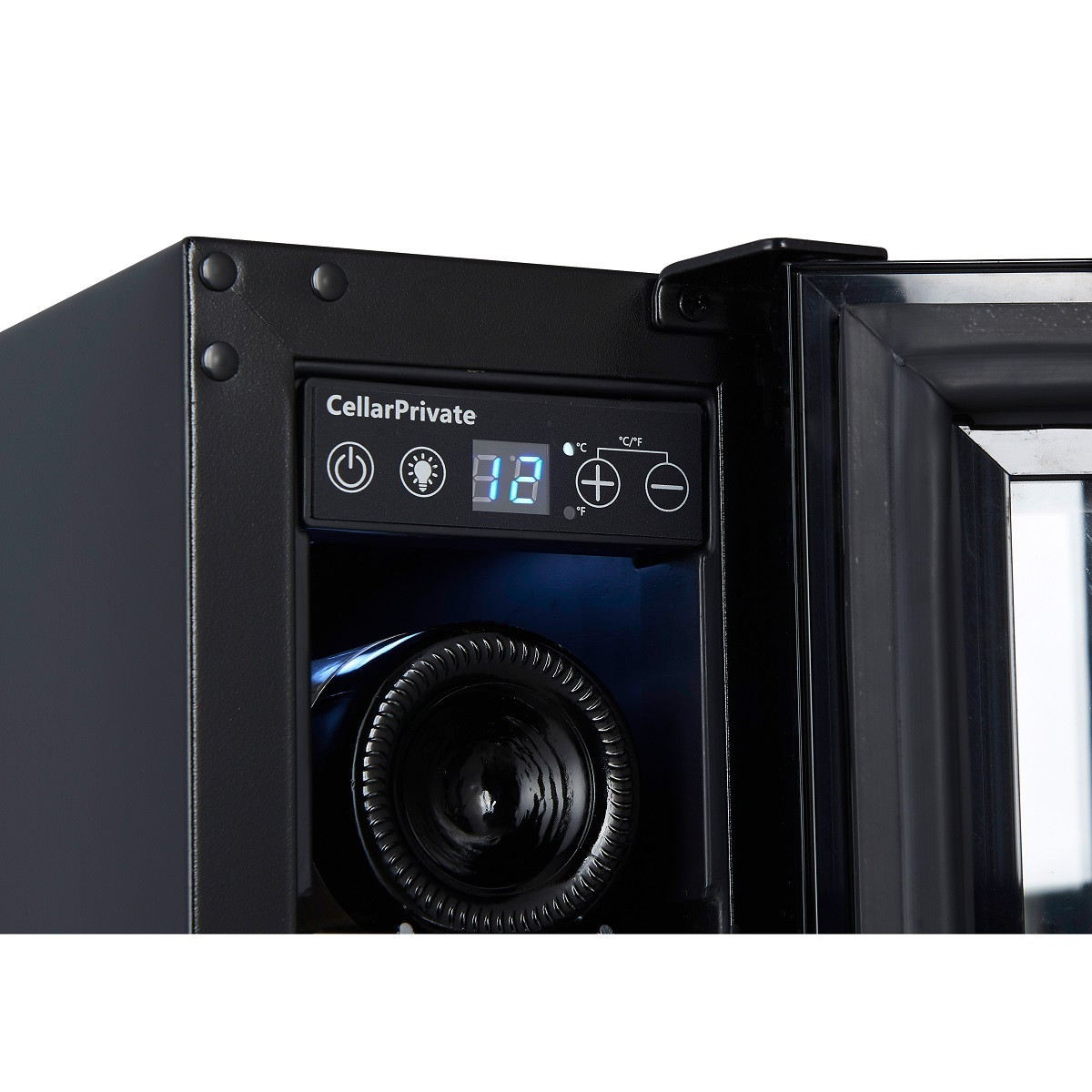 Эта модель винного шкафа не вибрирует внутри камер, что является обязательным условием для хранения вина, а также исключает попадание ультрафиолета через дверное стекло. Каждая бутылка вина постоянно вентилируется бесшумными вентиляторами, установленными внутри винного шкафа. Постоянная температура в камере регулируется с помощью сенсорных кнопок, расположенных за дверцей, а цифровой индикатор отображает реальную температуру в камере.