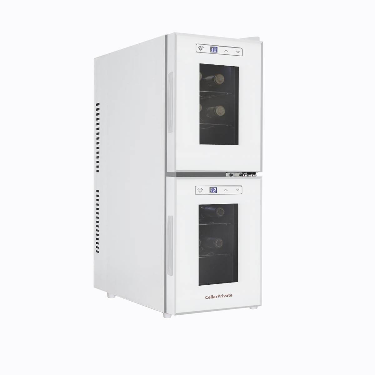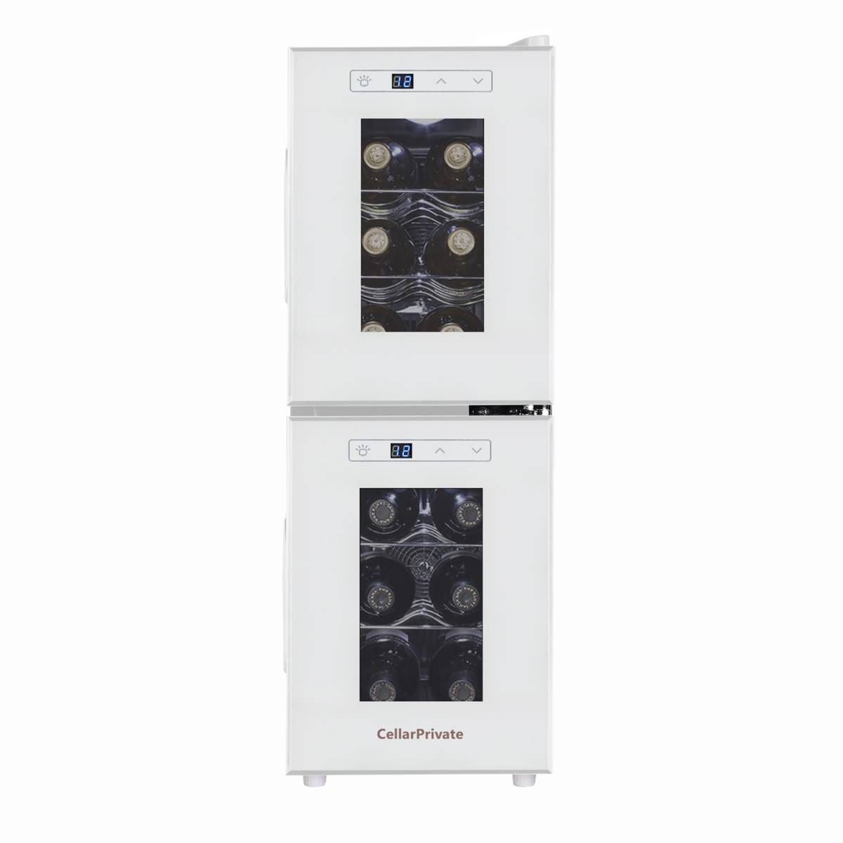 CellarPrivate CP012-2W это двух камерный холодильник для вина, вместимостью до 12 бутылок. Температура выставляется в каждой камере раздельно, что позволяет хранить одновременно красные и белые вина.