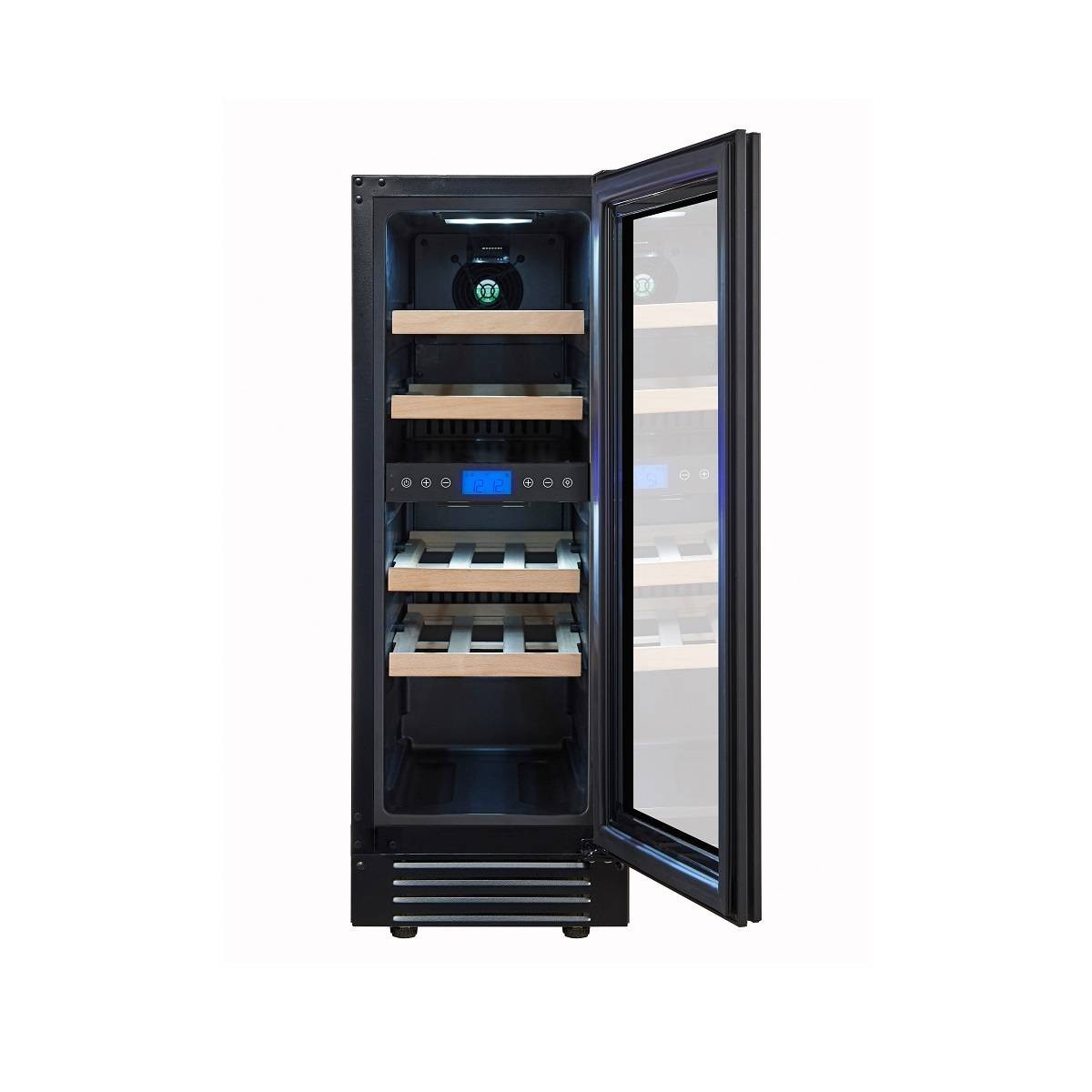 Постоянное проветривание бутылок обеспечивается бесшумными вентиляторами, установленными внутри, это предотвращает появление посторонних запахов и образование плесени. CellarPrivate CP017-2TBH оснащен четырьмя деревянными съёмными полками, на которых с легкостью разместятся любые бутылки. Дверь можно перевесить так, чтобы она открывалась справа налево.