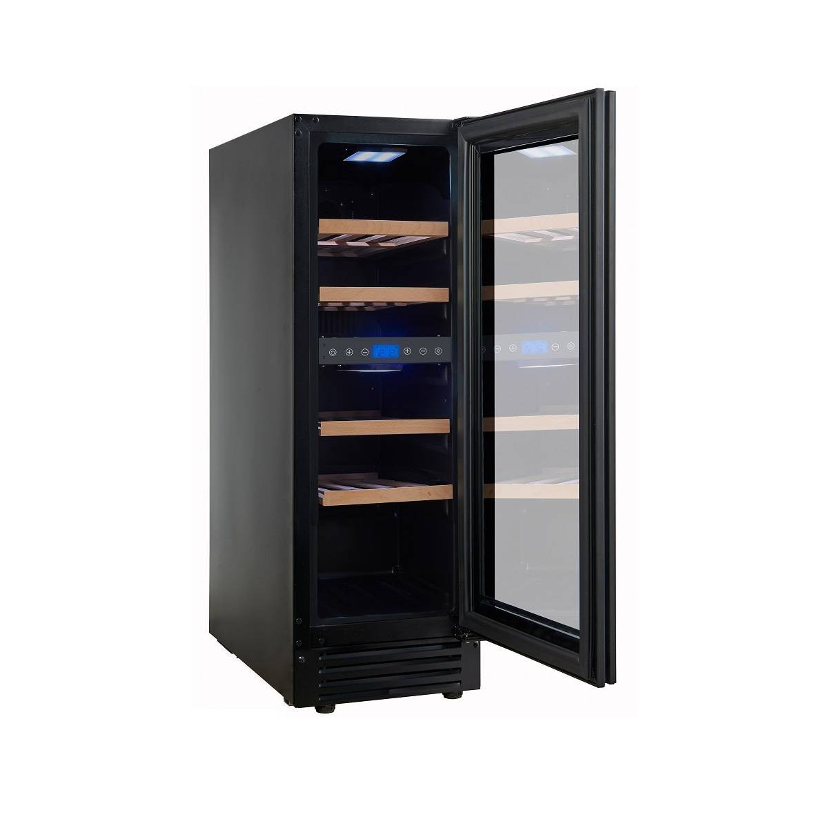 Сенсорные кнопки управления температурой и подсветкой расположены на панели за стеклянной дверцей.