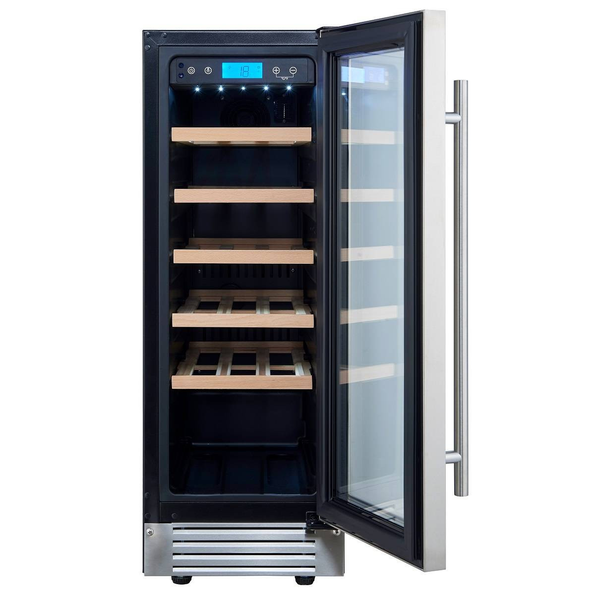 Сенсорные кнопки управления температурой и подсветкой расположены на панели за стеклянной дверцей.