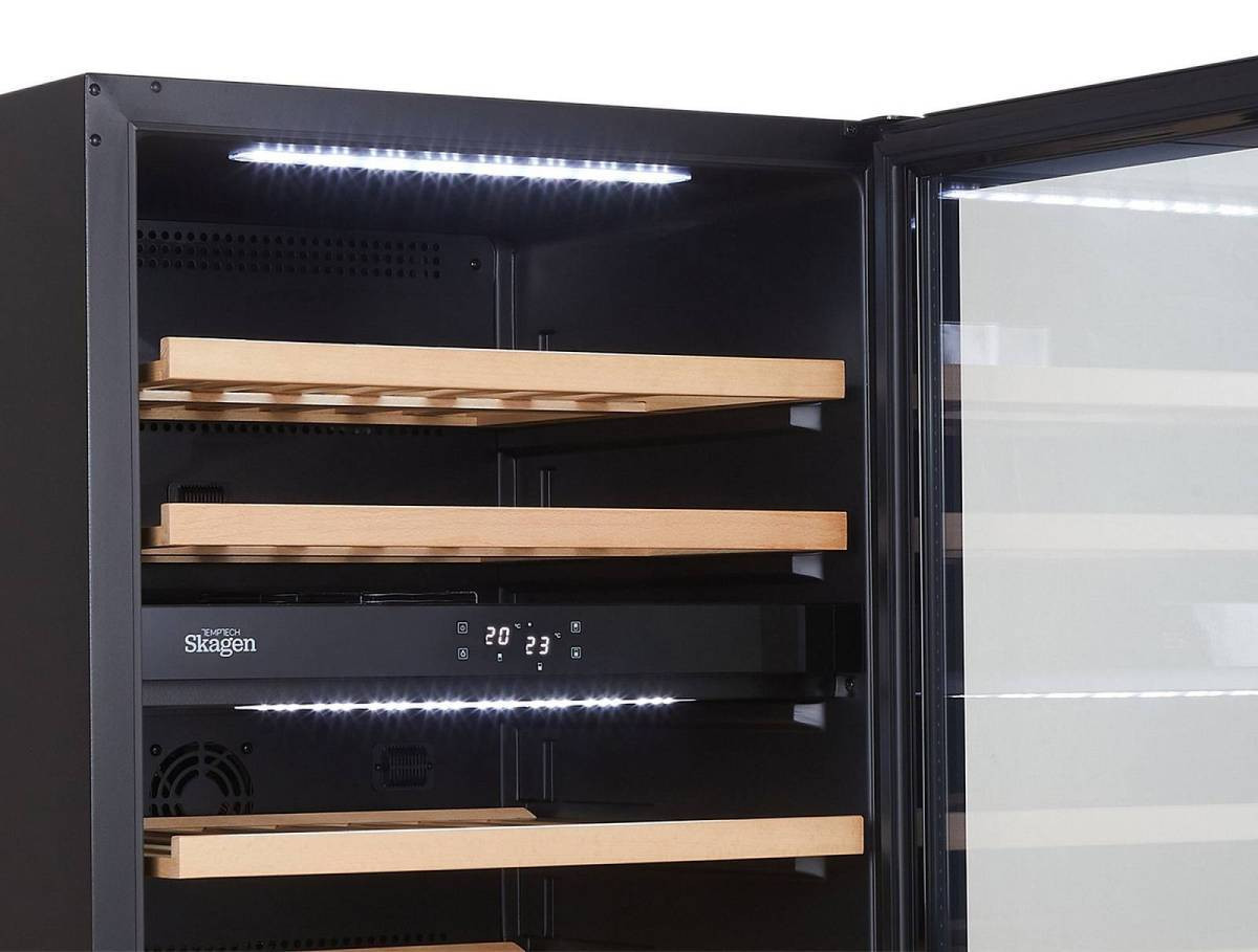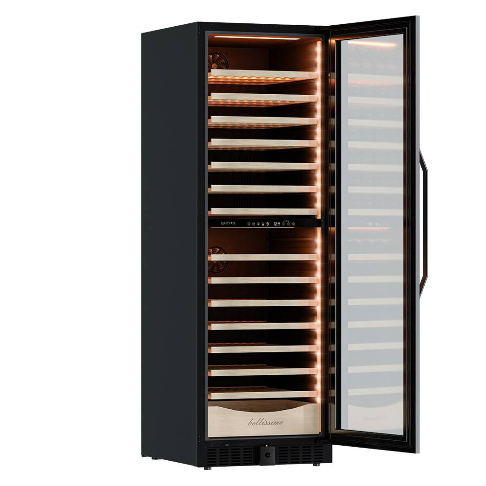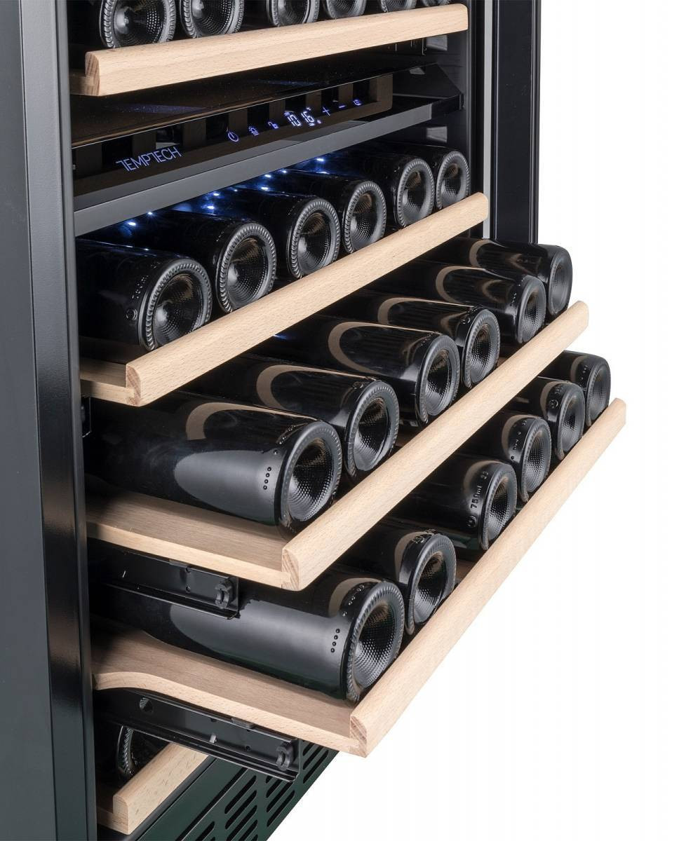 Постоянное проветривание бутылок обеспечивается бесшумными вентиляторами, установленными внутри камеры это предотвращает появление посторонних запахов и образование плесени. Cellar Private CP023 оснащен 4 деревянными съёмными полками.