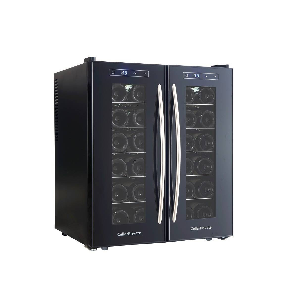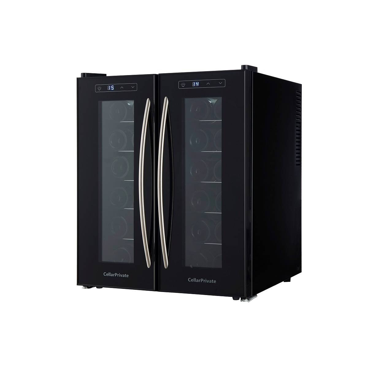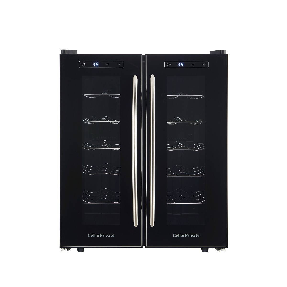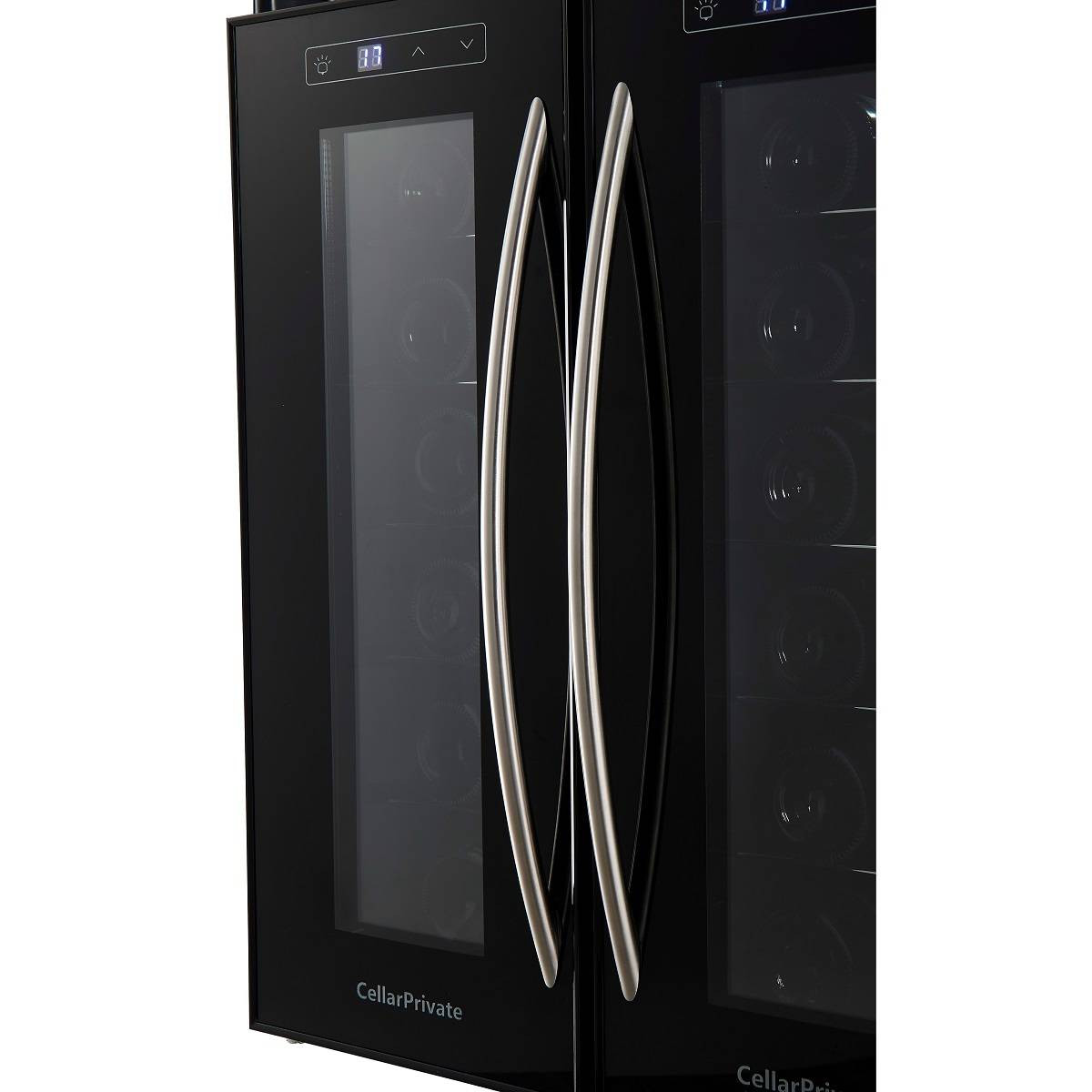 CellarPrivate CP024-2T это двух камерный винный шкаф с двумя дверцами, которые открываются нараспашку. Вместимость до 24 бутылок. Температура выставляется в каждой камере раздельно, что позволяет хранить одновременно красные и белые вина.