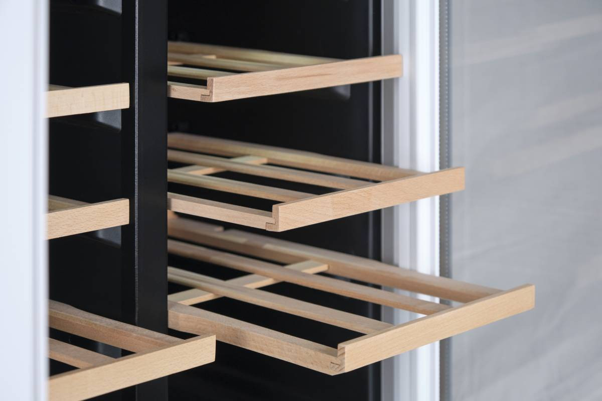 Постоянное проветривание бутылок обеспечивается бесшумными вентиляторами, установленными внутри камер это предотвращает появление посторонних запахов и образование плесени. CellarPrivate CP042-2TW оснащен десятью деревянными съёмными полками, на которых с лёгкостью разместятся любые бутылки.