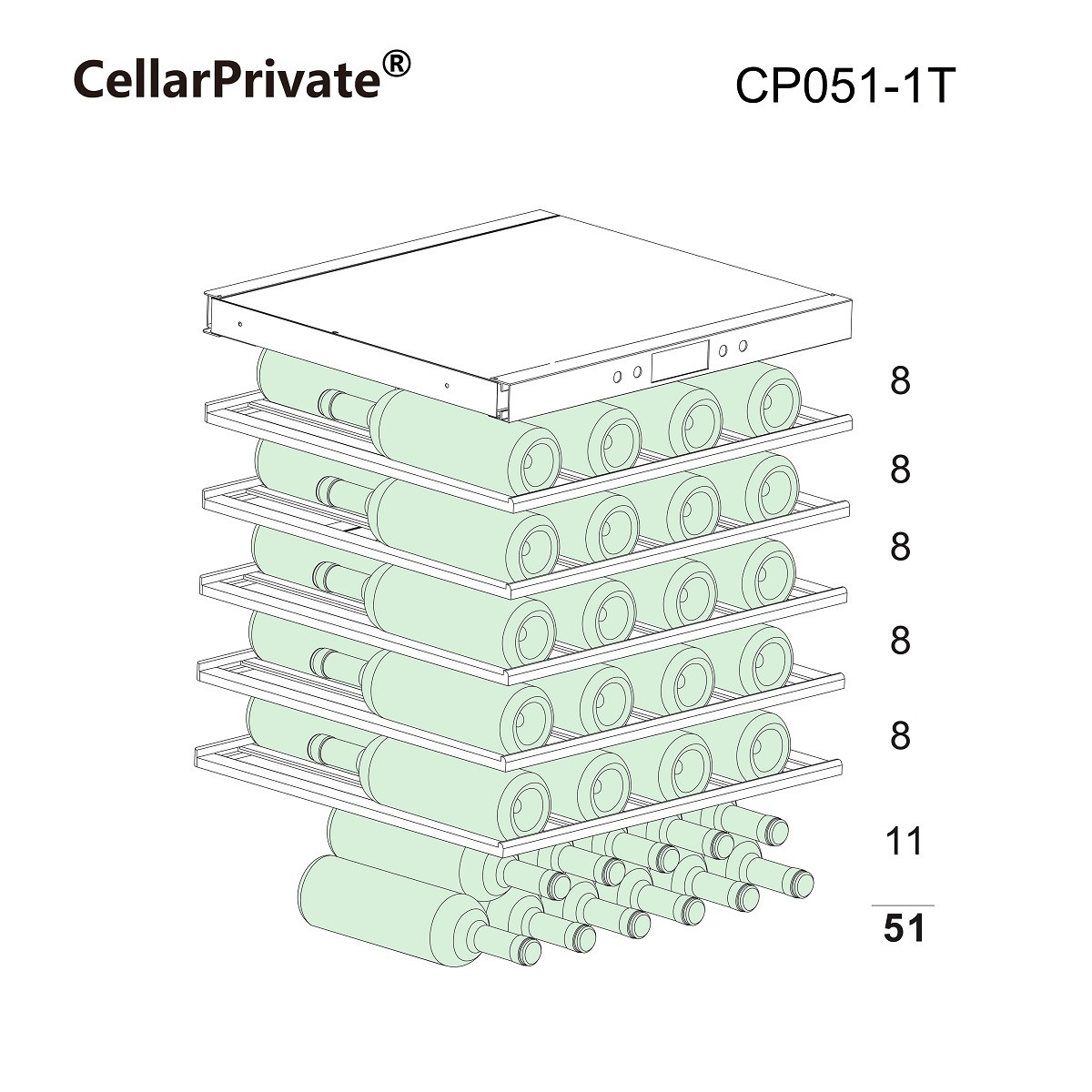 CP051-1T можно встраивать в под столешницу либо в любую нишу, также можно использовать и как отдельно стоящий винный шкаф. Высота регулируется при помощи ножек.