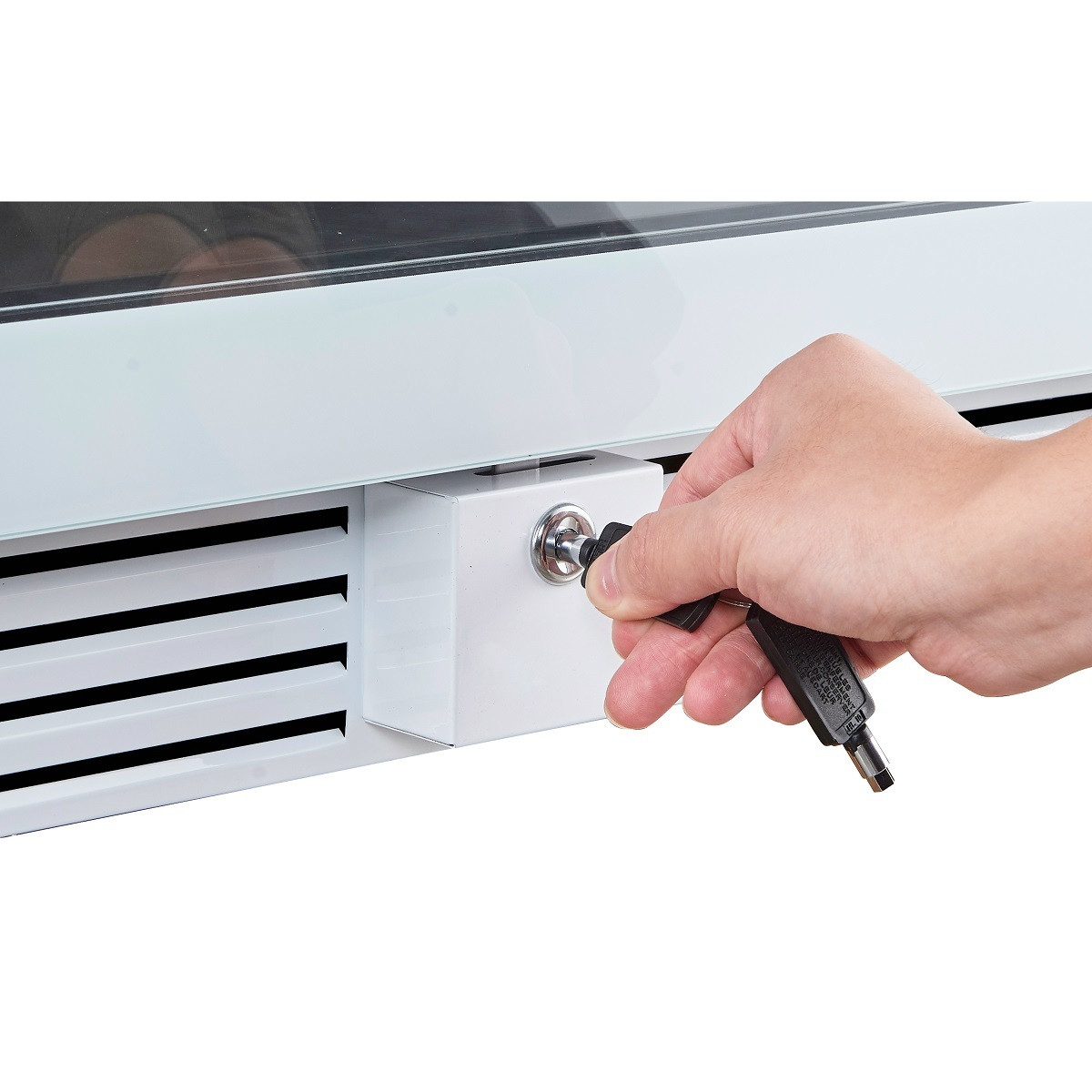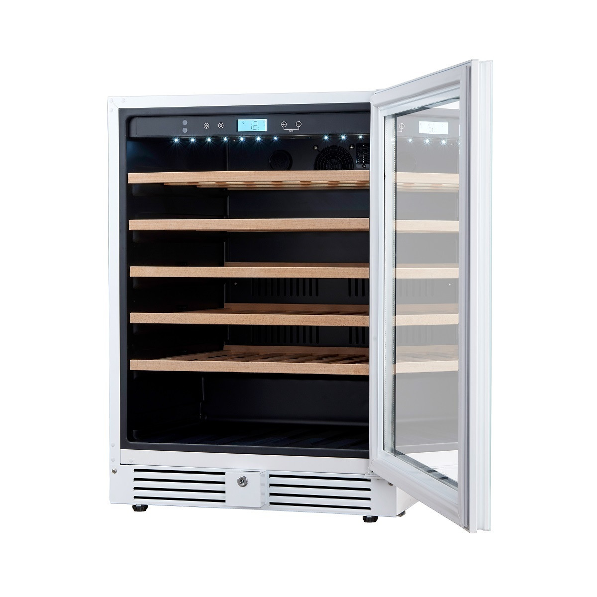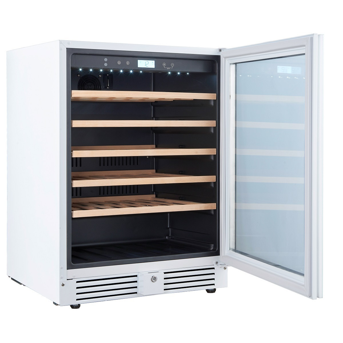 Постоянное проветривание бутылок обеспечивается бесшумными вентиляторами, установленными внутри камер это предотвращает появление посторонних запахов и образование плесени. CellarPrivate CP051-1TH оснащён пятью деревянными съёмными полками, на которых с легкостью разместятся любые бутылки. Дверь можно перевесить так, чтобы она открывалась справа налево.