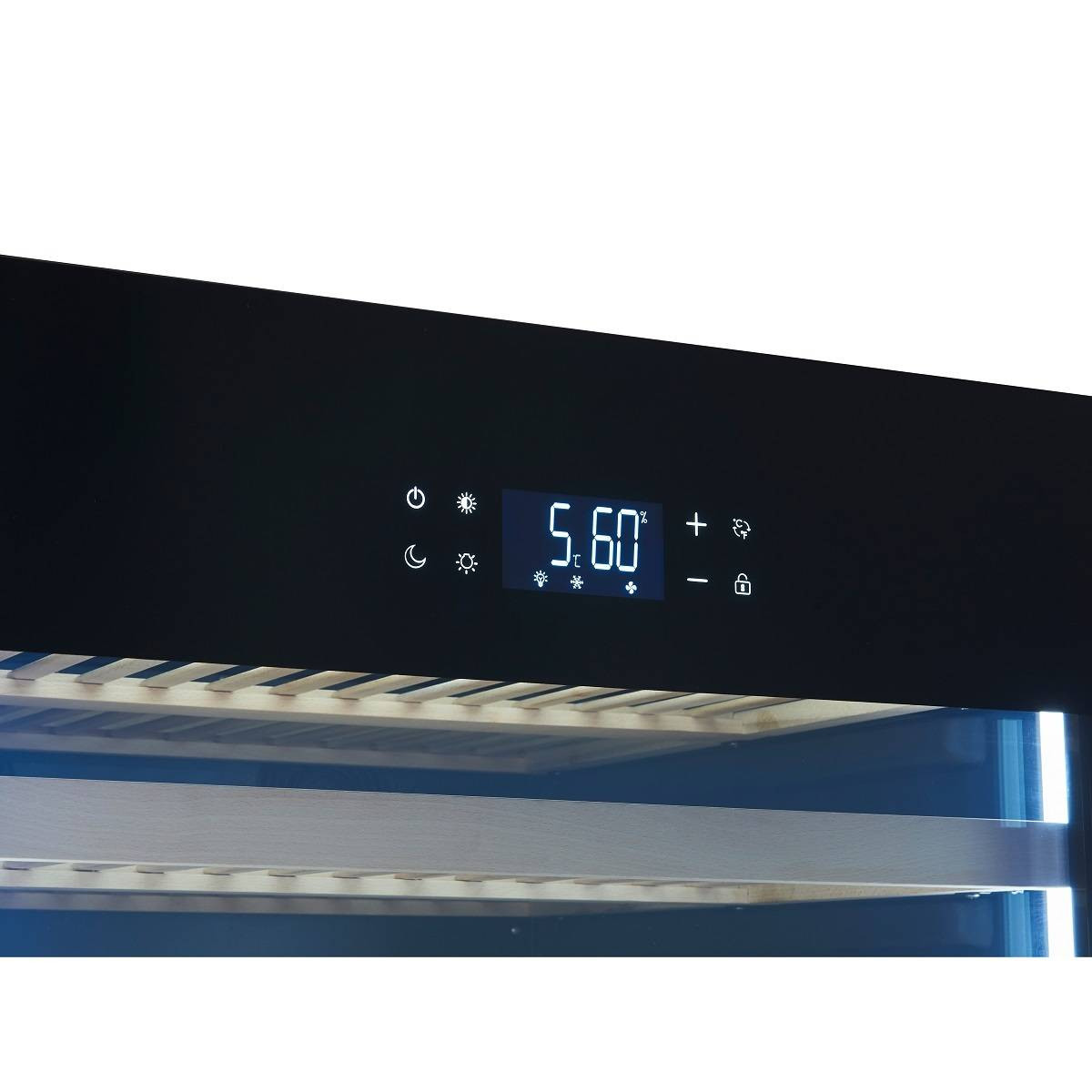 Сенсорные кнопки управления температурой и подсветкой расположены на стеклянной дверце.