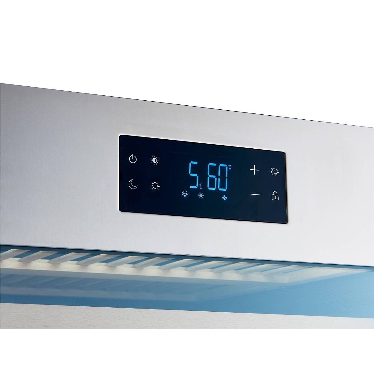 Сенсорные кнопки управления температурой и подсветкой расположены на стеклянной дверце.