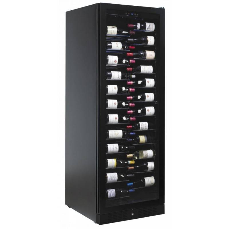 Винный шкаф DX-143.468B выполнен в элегантном металлическом черном корпусе. Дверца полностью стеклянная с удобной, утопленной ручкой. Модель укомплектована тонированными витринными полками. Они позволяют размещать бутылки горизонтально в шахматном порядке. При таком расположении видна этикетка каждой бутылки, а, следовательно, весь ассортимент. Угольный фильтр служит для улучшения воздухообмена в шкафу, очищения от посторонних запахов и устранения лишней влаги. Дверь шкафа можно перенавешивать, в ней имеется замок. Фасад двери выполнен полностью из тонированного стекла с защитой от ультрафиолетовых лучей. Шкаф вмещает в себя 143 бутылки типа Бордо, имеет одну зону охлаждения и поддерживает температуру от +5°C до +22°C. В верхней части есть сенсорная панель, с помощью которой пользователь выбирает необходимый температурный режим работы в камере. На ней также расположены сенсорные кнопки для регулировки температуры и включения освещения. Данные термостата демонстрирует цифровой экран с приятной светодиодной подсветкой синего цвета.