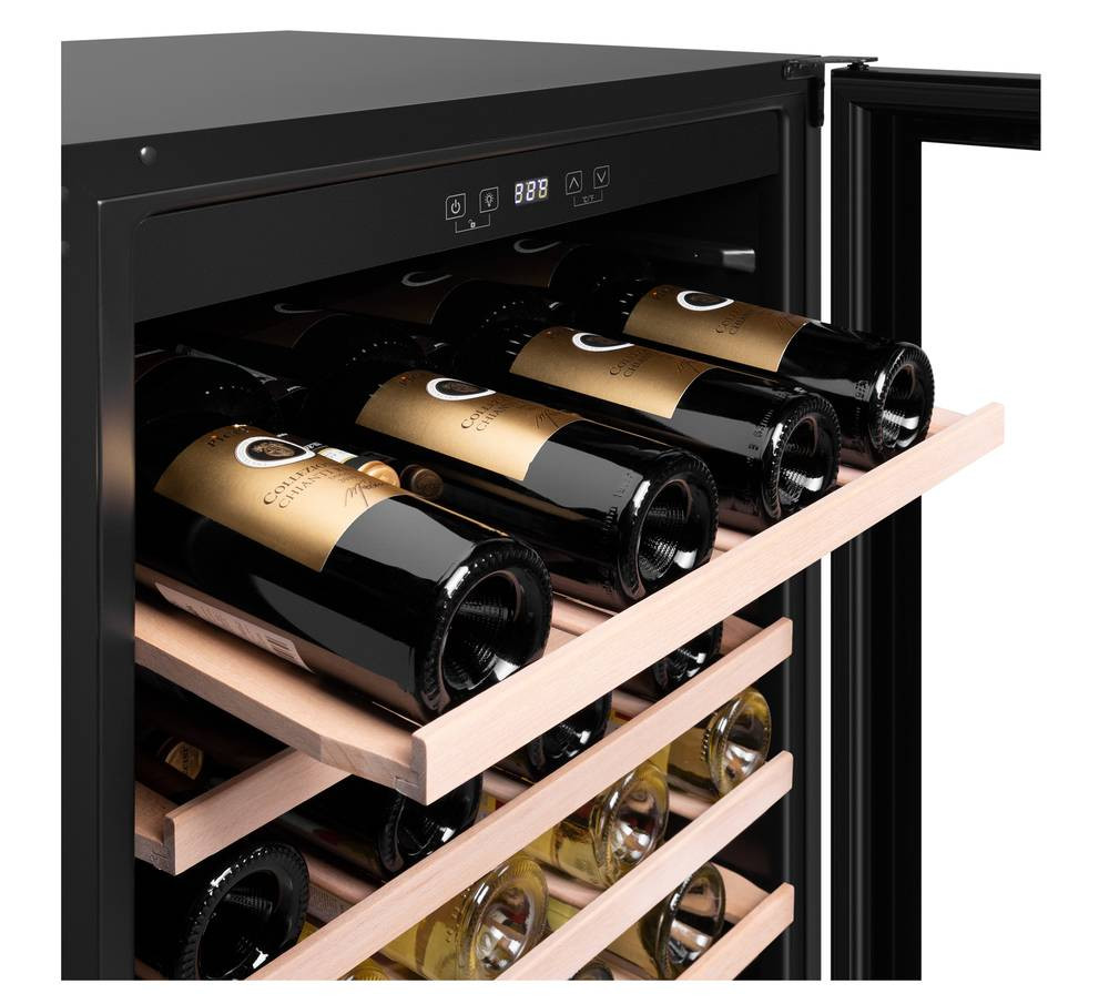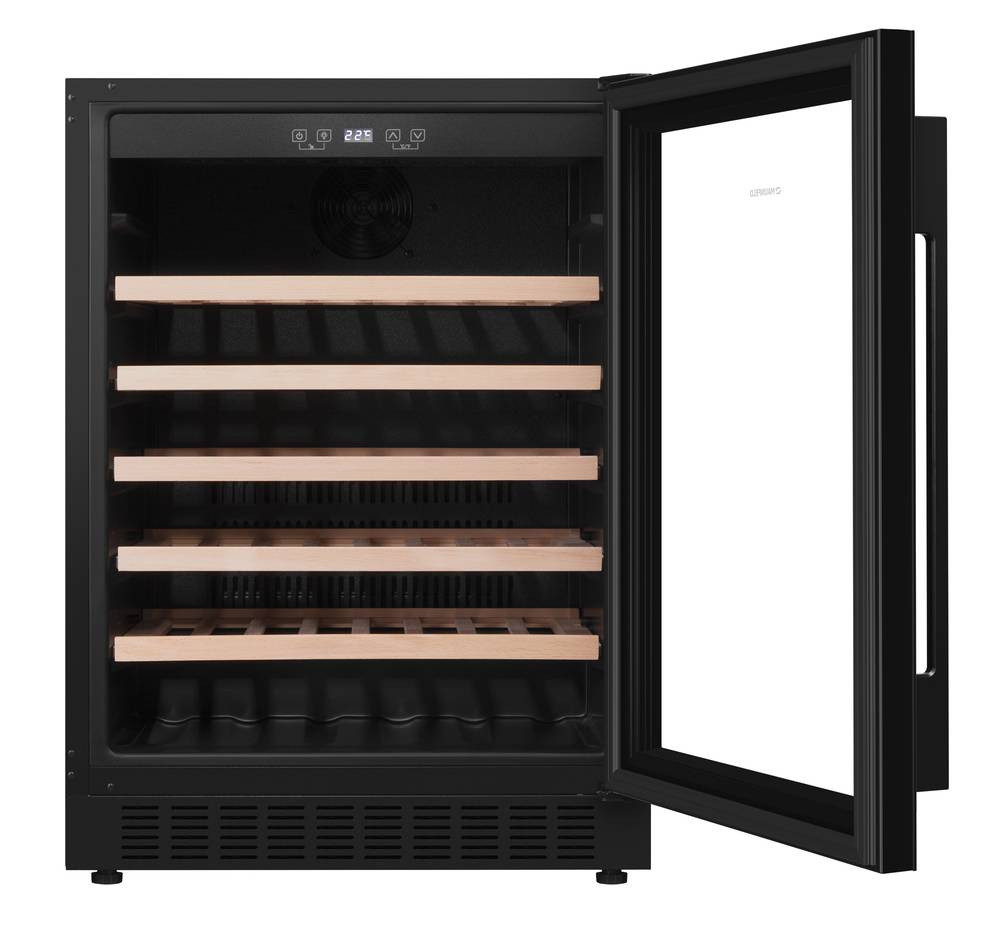 Благодаря продуманному внутреннему исполнению и съемным полкам вы сможете размещать до 54 бутылок. При желании можно извлечь несколько полок и разместить большее количество бутылок.