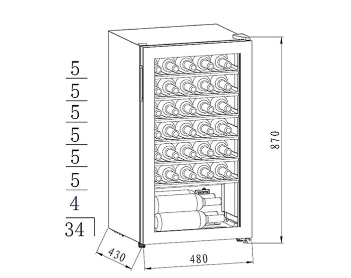 Внутреннее пространство рассчитано на хранение до 34 бутылок. При желании можно извлечь полку и разместить большее количество бутылок.