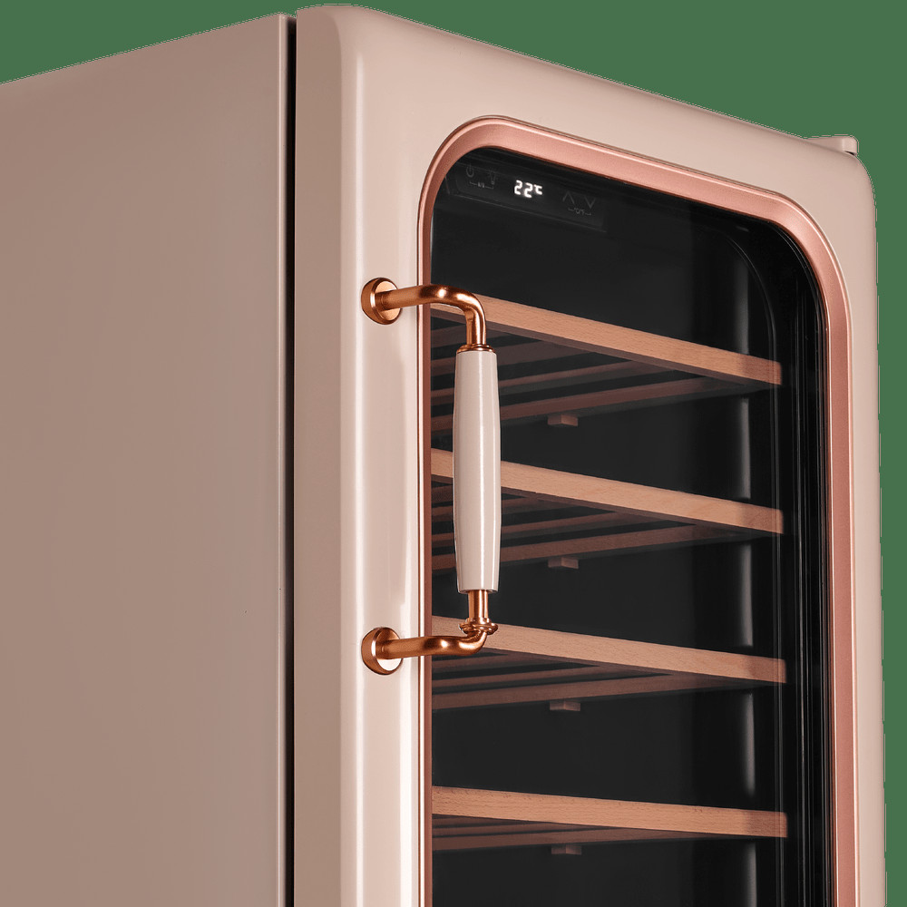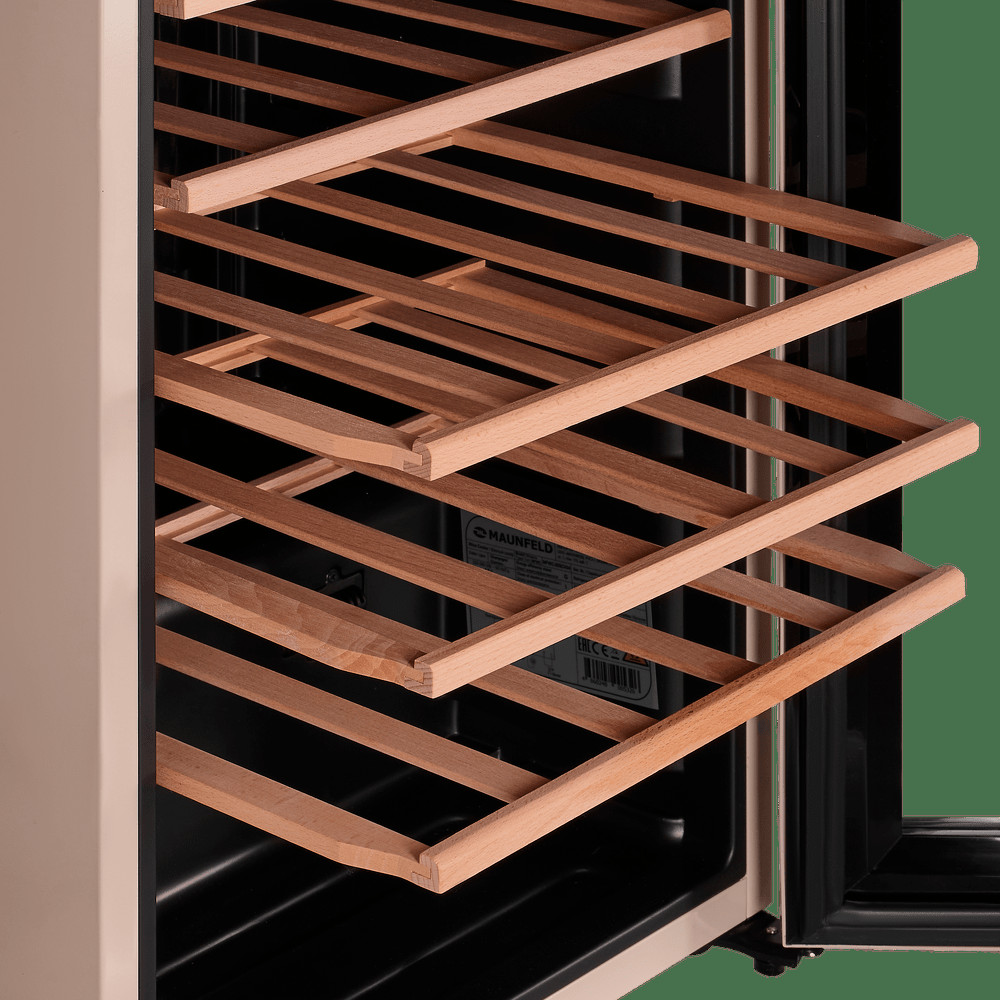 Дерево – эстетика и сохранность вина. Винный шкаф оснащен деревянными полками, что является лучшим выбором для хранения вина. Такие полки снижают возможную вибрацию, положительно влияя на качество вина, и уменьшают шум во время эксплуатации.