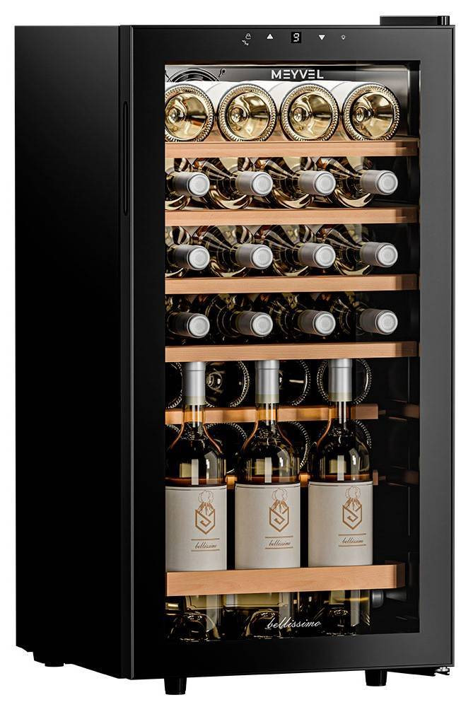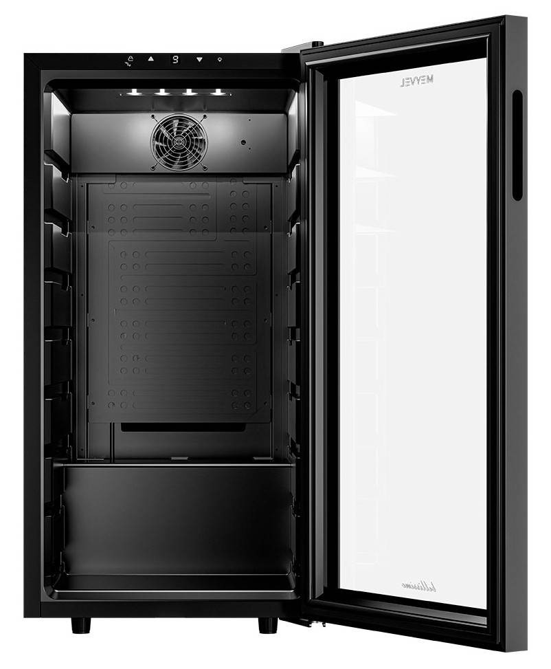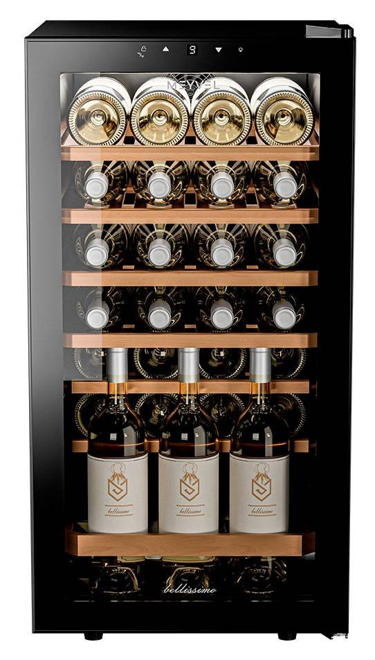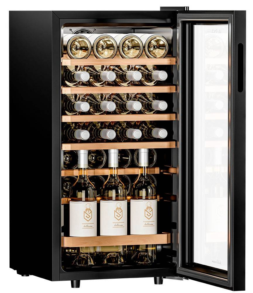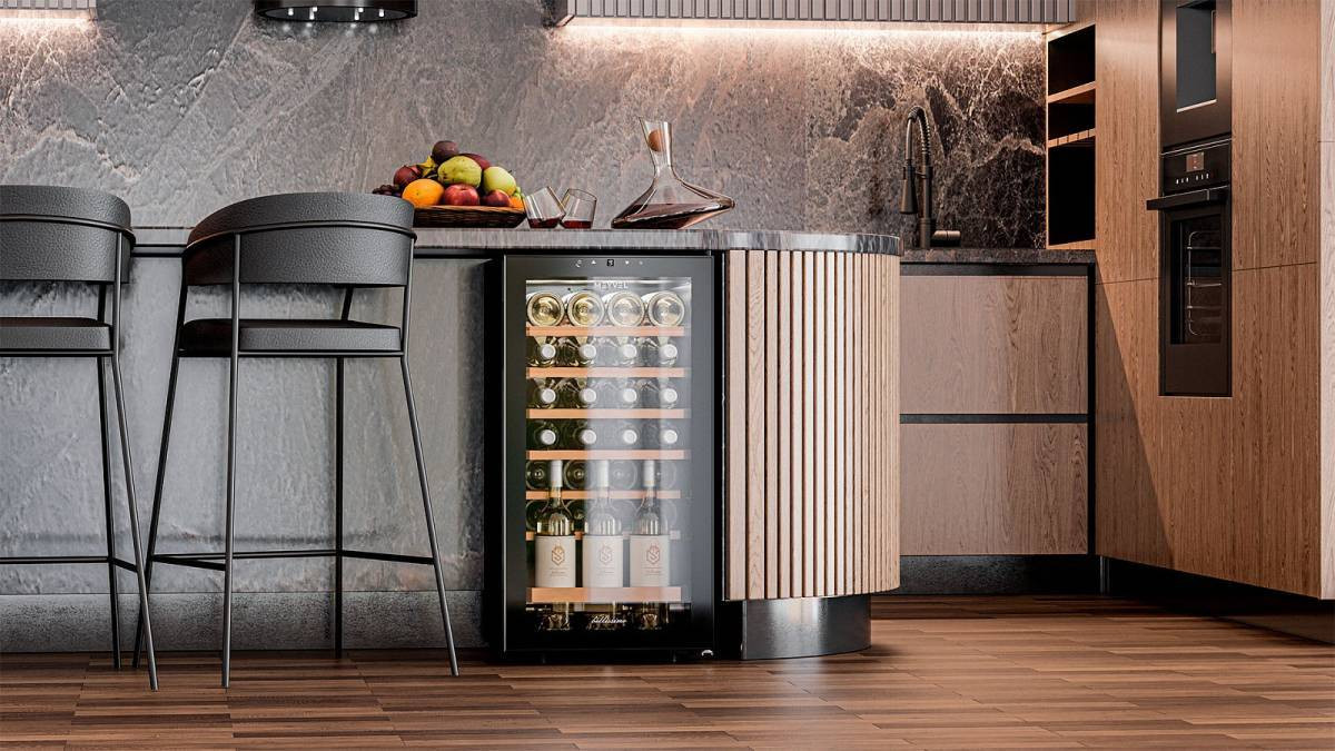 Шкаф вмещает до 28 бутылок и обеспечивает оптимальные условия для длительного хранения вина. Температура внутри поддерживается в диапазоне от +5 до +18°C, а влажность — 60–80%.