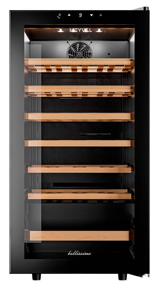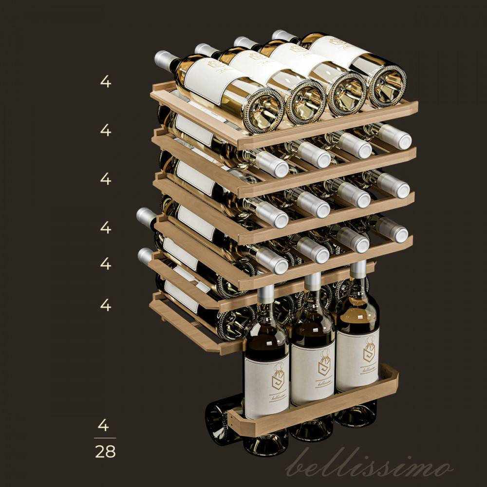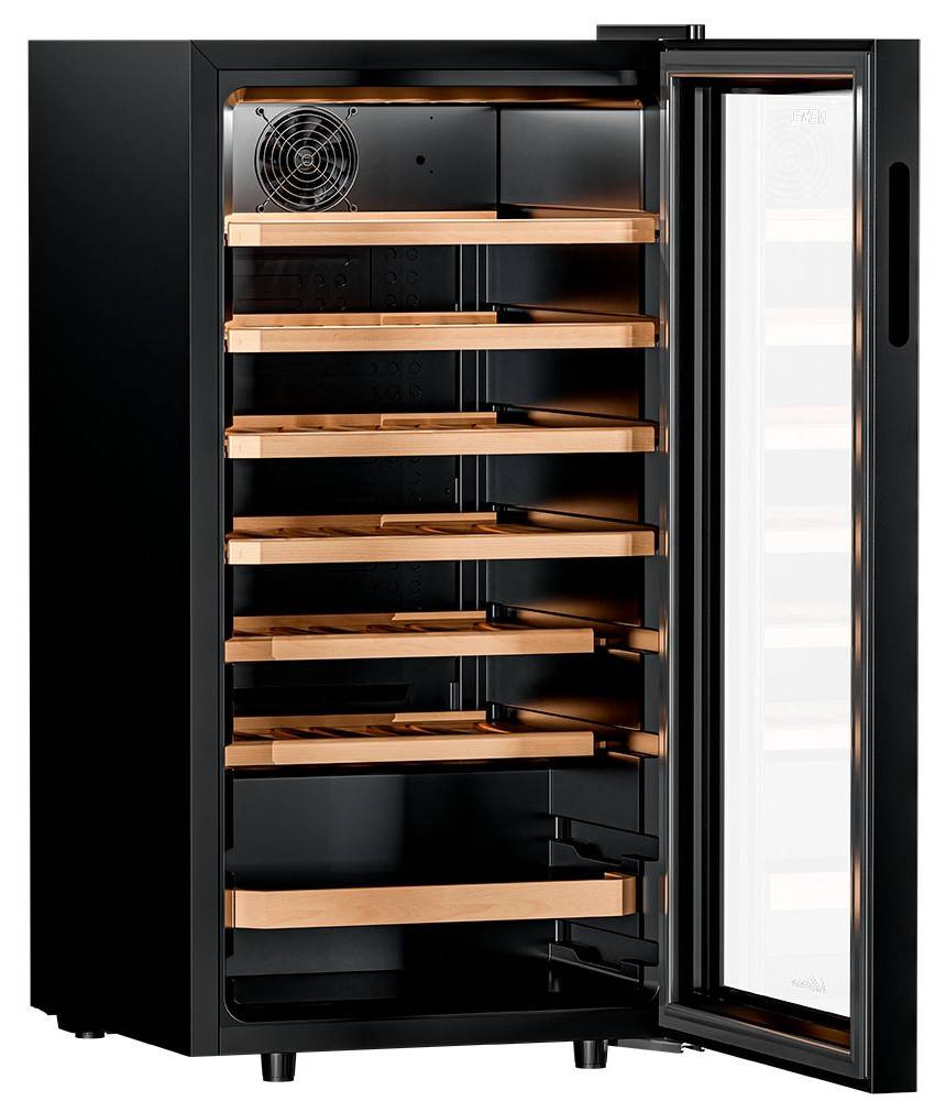 6 выдвижных полок из бука обеспечивают удобный доступ к вину. Нижняя полка предназначена для демонстрации лучших экземпляров коллекции.