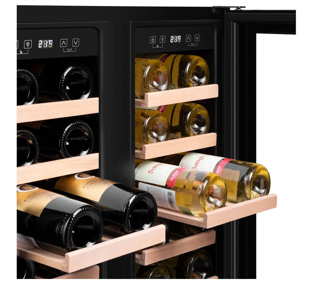 Шкаф имеет две зоны, для каждой из них можно задать свой режим охлаждения — это актуально для тех, кто планирует хранить дома разные виды напитка: красное, белое, шампанское.