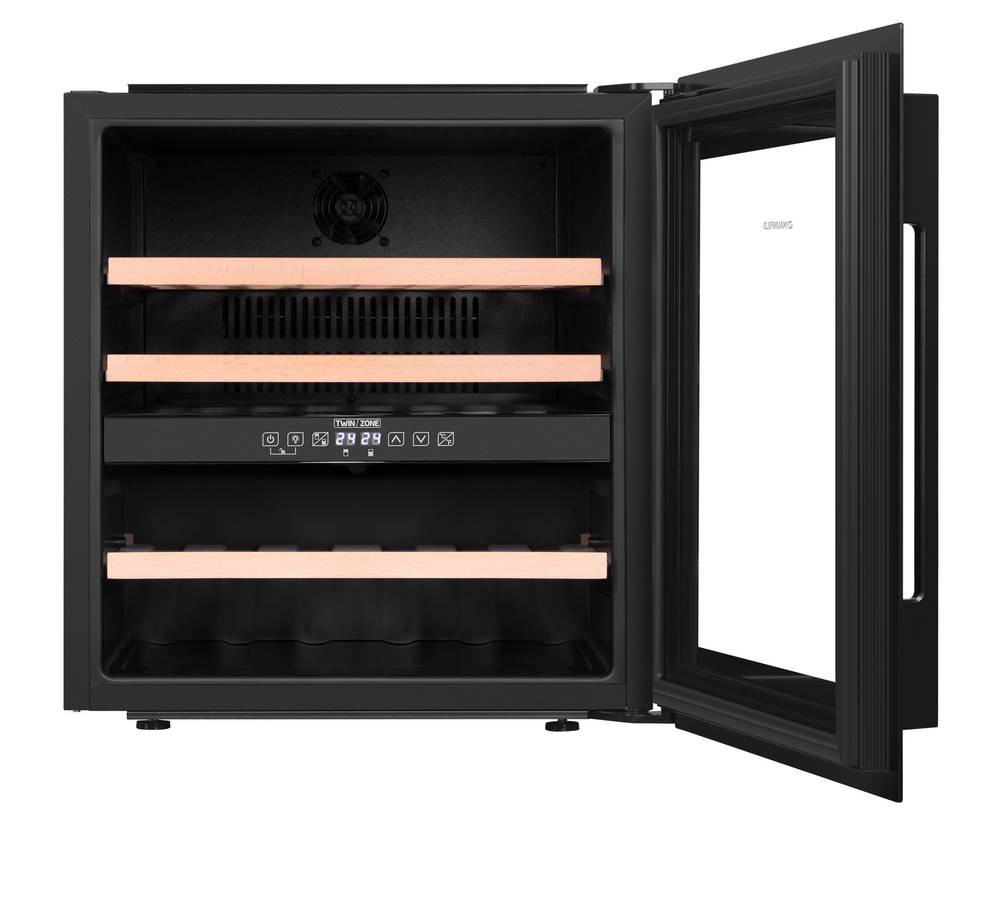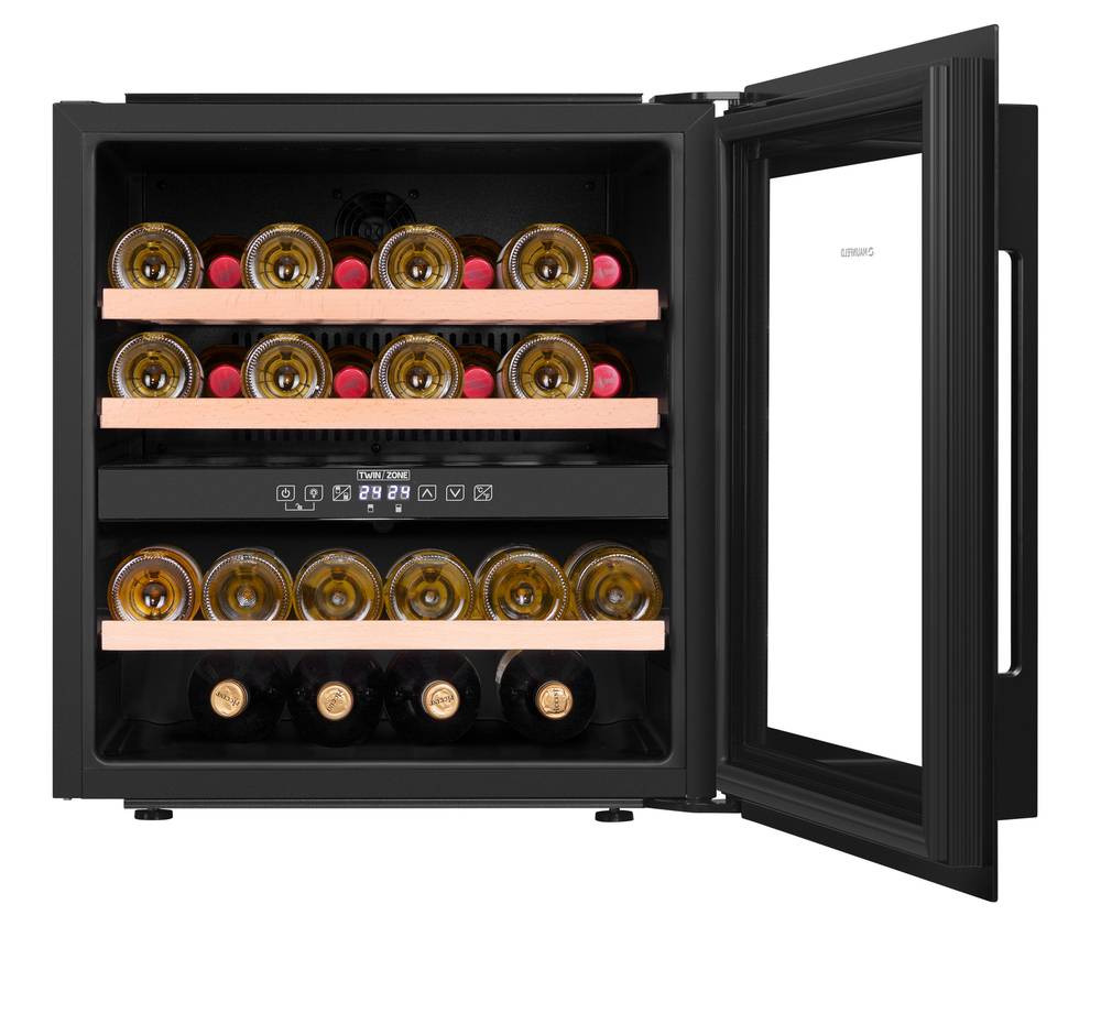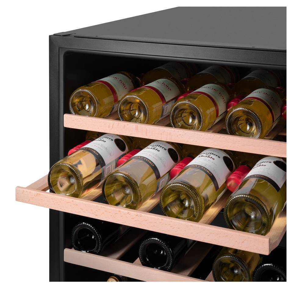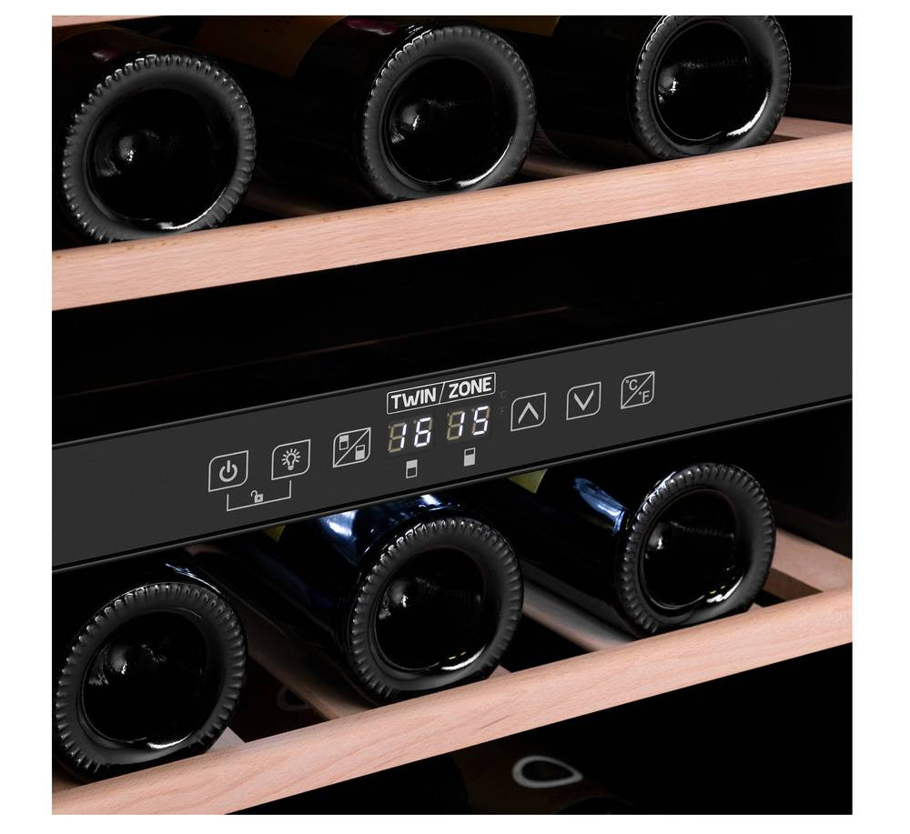 Шкаф имеет две зоны, для каждой из них можно задать свой режим охлаждения — это актуально для тех, кто планирует хранить дома разные виды напитка: красное, белое, шампанское.