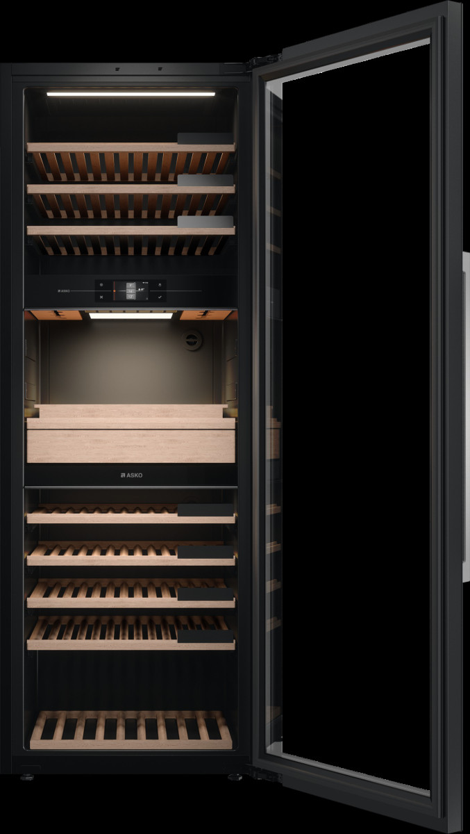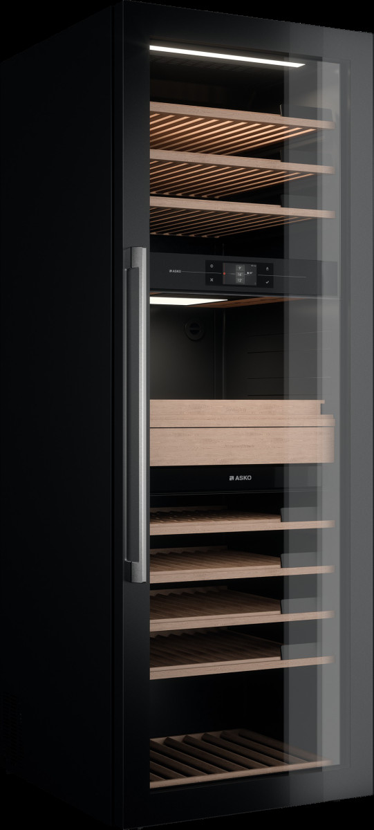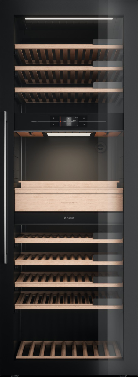 Модель предназначена для хранения до 190 бутылок вина (0,75 л) на деревянных стойках с мягкими телескопическими направляющими. Высококачественное стекло двери с УФ-фильтром защищает напитки от вредных ультрафиолетовых лучей. Для оптического считывания этикеток винных бутылок используется сенсорный дисплей. Он собирает и хранит данные, также предназначен для дальнейшего ведения инвентаря винного шкафа Аско WCH3119422G. Бутылки и декандеры (графины и другие ёмкости) здесь стоят вертикально. Чтобы они не упали во время открывания и закрывания двери, есть особые держатели. В выдвижном ящике хранятся аксессуары, в том числе специальные приспособления: аэраторы (насадки для разлива по бокалам), струеры (дозаторы), штопоры и тому подобные изделия.
