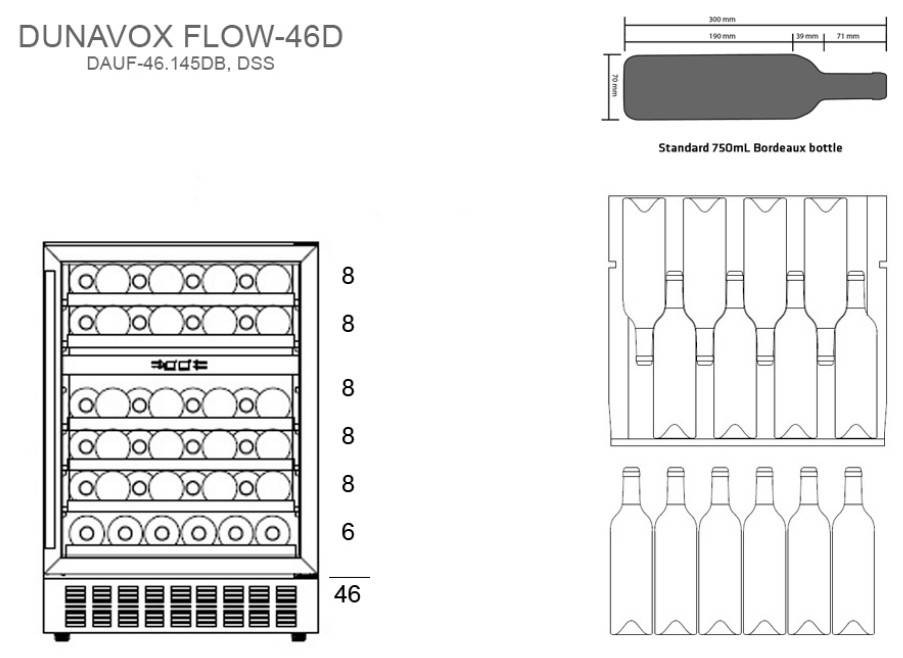 Бутылки располагаются на деревянных выдвижных полках, расположенных параллельно полу, что предотвращает пересыхание пробки и сохраняет свежесть вина. В винном шкафу предусмотрены две температурные зоны: верхняя с диапазоном от +5 до +12°С и нижняя с диапазоном от +12 до +20°С, что позволяет хранить широкий ассортимент вин. Для усиления эффекта хранения, в DAUF-46.145DBH предусмотрена белая, янтарная или светодиодная подсветка. Стекло оснащено УФ-фильтром, что обеспечивает защиту от вредных ультрафиолетовых лучей.