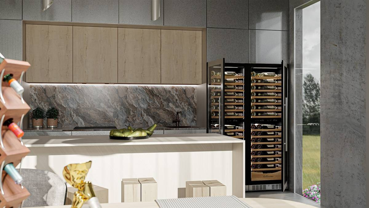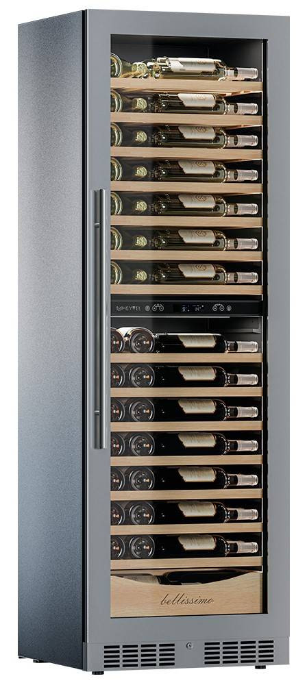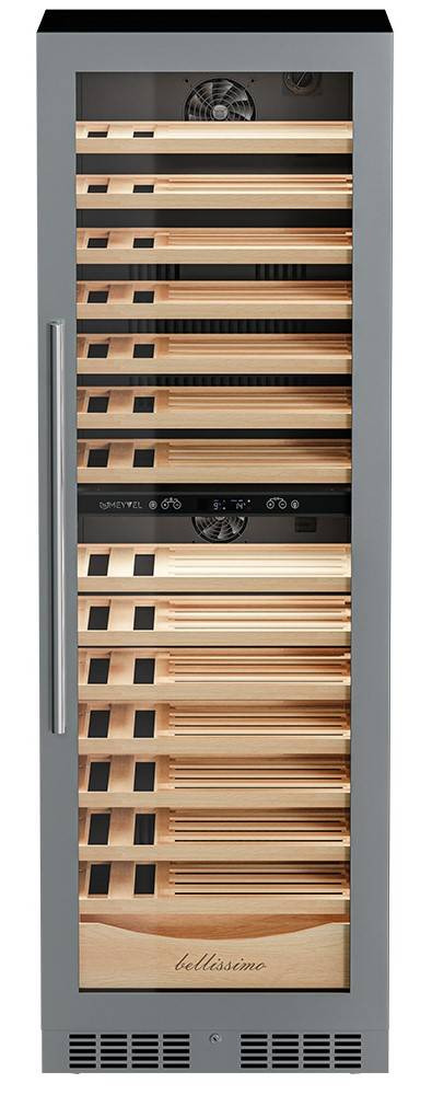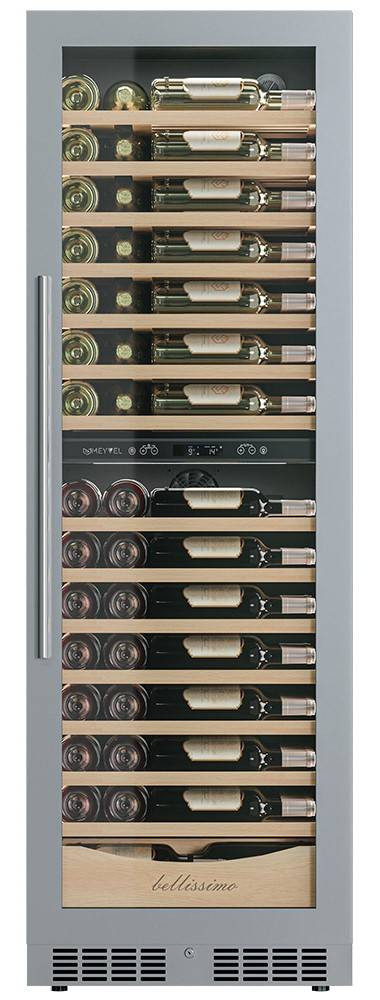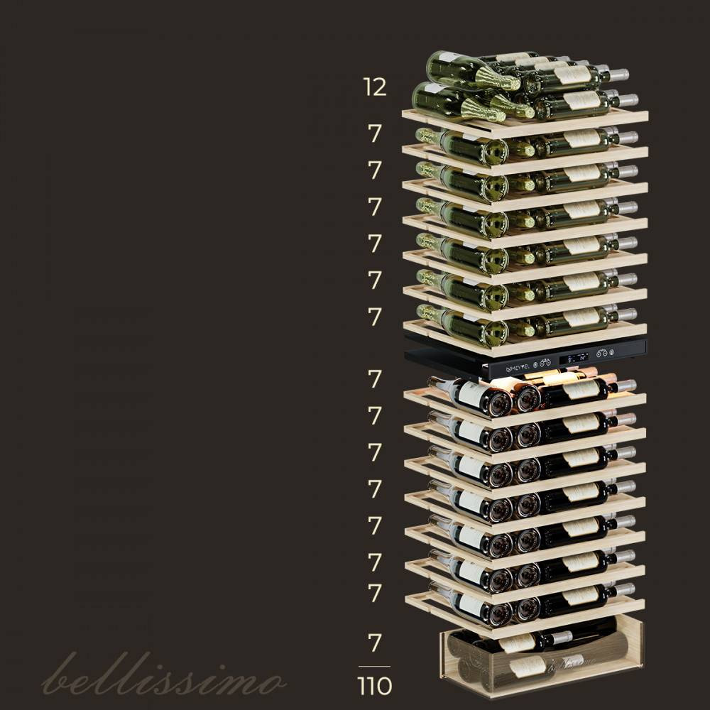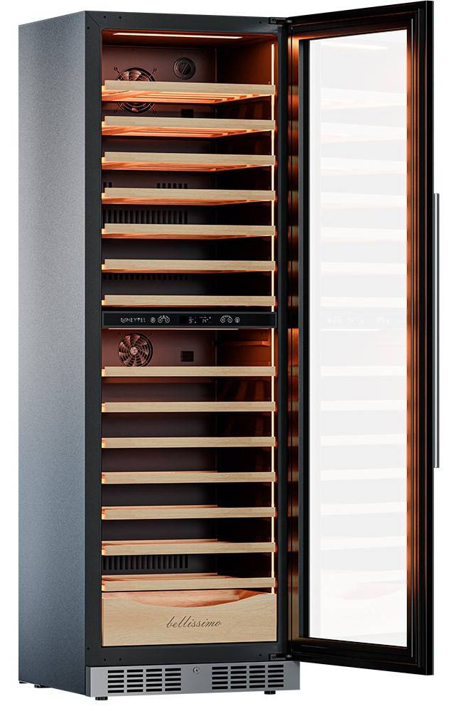 Внутреннее пространство винного шкафа разделено на две температурные зоны, что позволяет хранить различные виды вина при идеальной температуре или устанавливать разные значения для напитков, которые всегда будут готовы к подаче. В каждой зоне предусмотрена полка с увеличенным пространством, что позволяет разместить не только стандартные бутылки Бордо, но и Магнумы. Если необходимо разместить что-то большее, можно вынуть одну или несколько полок. Внизу находится выдвижной ящик, в котором можно хранить как бутылки с вином, так и винные аксессуары: штопор, бокалы, аэраторы, декантеры, каплеуловители и термометры. Если вынуть ящик, можно разместить в демонстрационном положении до 6 бутылок вина.